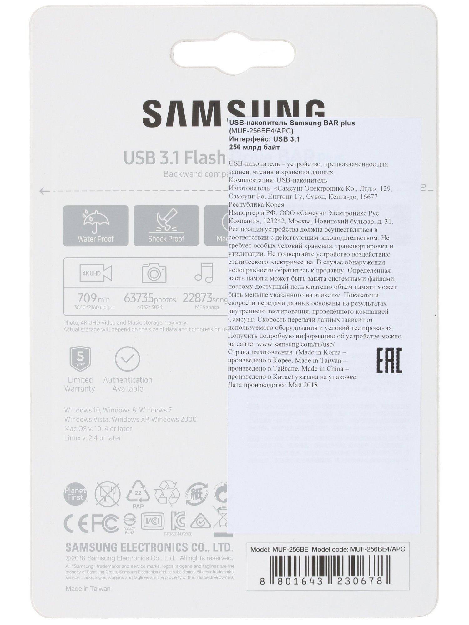 Память USB Flash Samsung BAR Plus необычайно стильно смотрится и позволяет обмениваться любой информацией. Благодаря большому объему (256 ГБ) и высокоскоростному интерфейсу USB 3.1 она подойдет даже для хранения видео в 4К. Его получится записать до 709 минут, а для загрузки полнометражного фильма в разрешении Ultra HD потребуются считанные секунды.