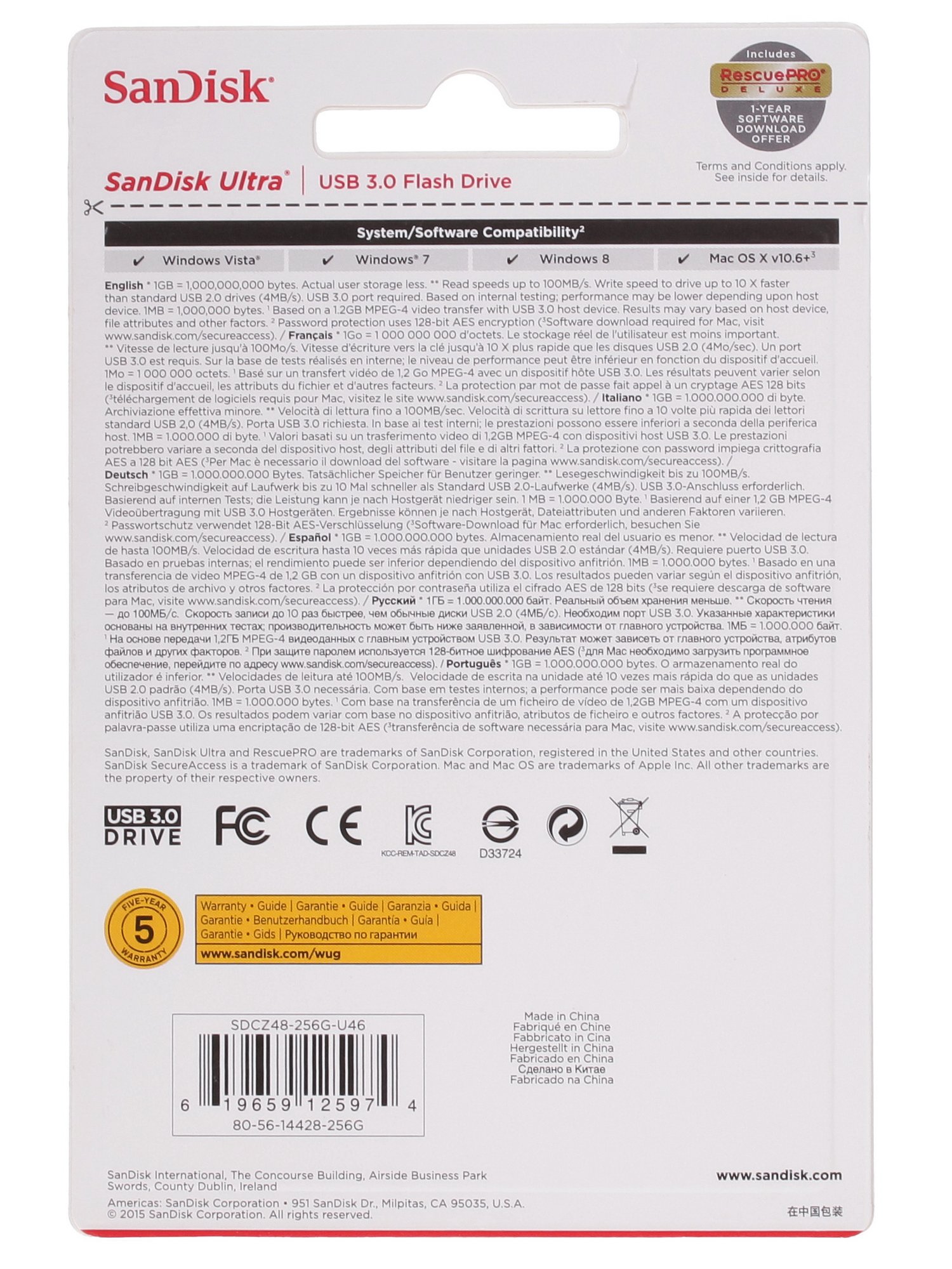 В то же время при своих вполне скромных размерах USB 3.0 Flash Sandisk 256 Gb Ultra способна хранить огромные пласты информации – до 256 Гб различных файлов может храниться одновременно на этом универсальном накопителе.