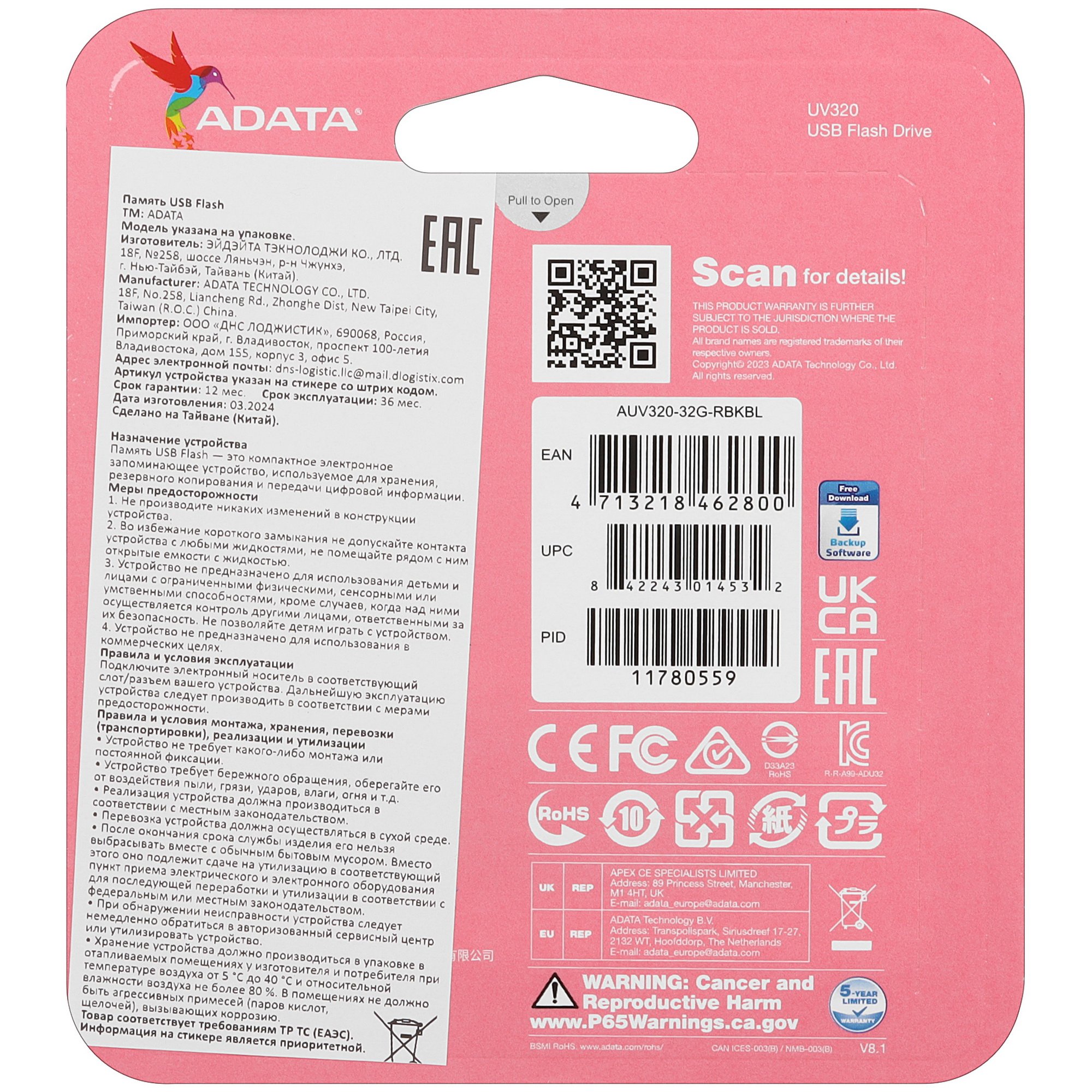 Флешка USB ADATA UV320 (AUV320-32G-RBKBL), 32Gb, USB 3.2 Gen 1, R/W 100/30, черный/голубой