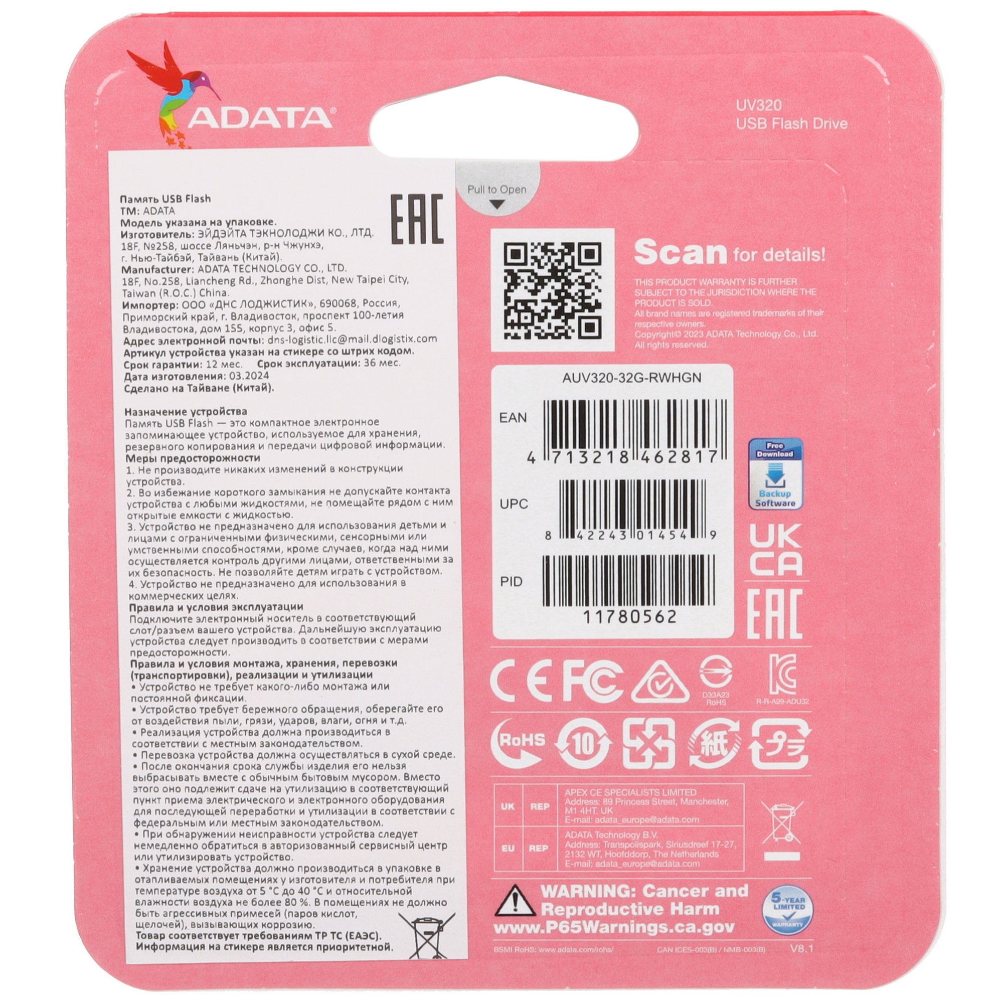 Data UV320 представлен в белом пластиковом корпусе в виде слайдера. С помощью клавиши вы можете выдвигать разъем для подключения к порту и задвигать внутрь для защиты от пыли, брызг и случайных повреждений. USB-накопитель с 32 ГБ памяти вмещает около 400 RAW-фотографий или 1 часовой видеоролик в 4K-формате.