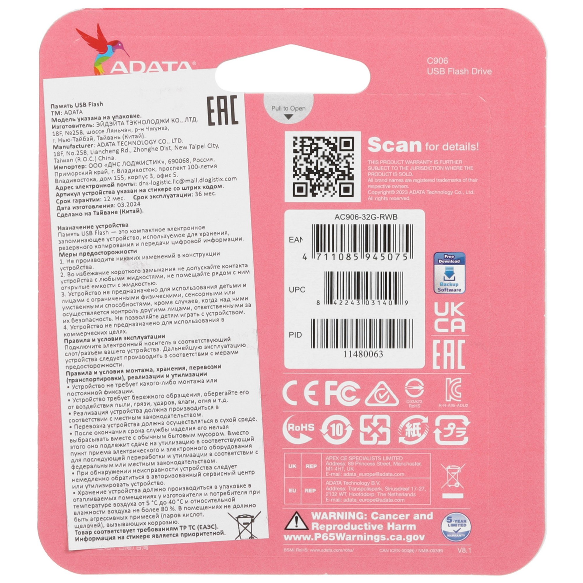 Флеш Диск A-DATA 32GB <AC906-32G-RWB> Classic C906, USB 2.0, Синяя