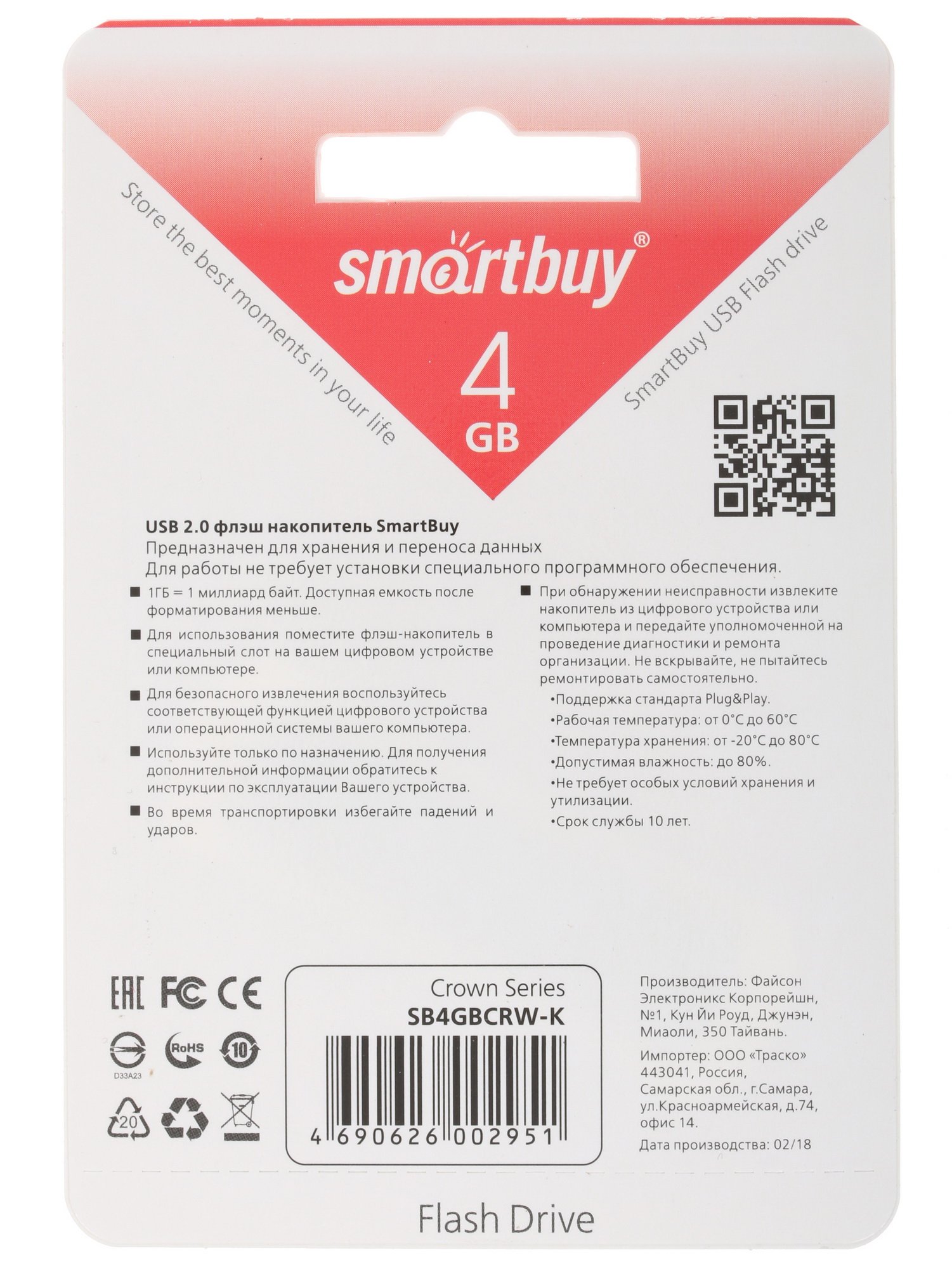 Память USB Flash Smartbuy Crown [SB4GBCRW-K] – простое в применении, надежное, функциональное устройство, которое прослужит вам долго и позволит иметь под рукой все важные данные. На него вы можете сбросить необходимую вам информацию с вашего ПК или ноутбука, например фильм и презентацию, объема в 4 ГБ будет достаточно. Компактная USB Flash Smartbuy Crown [SB4GBCRW-K] имеет стандарт USB 2.0, ее разъем защищен съемным колпачком и оснащен отверстием для шнурка, чтобы память не потерялась и не выпала случайно.