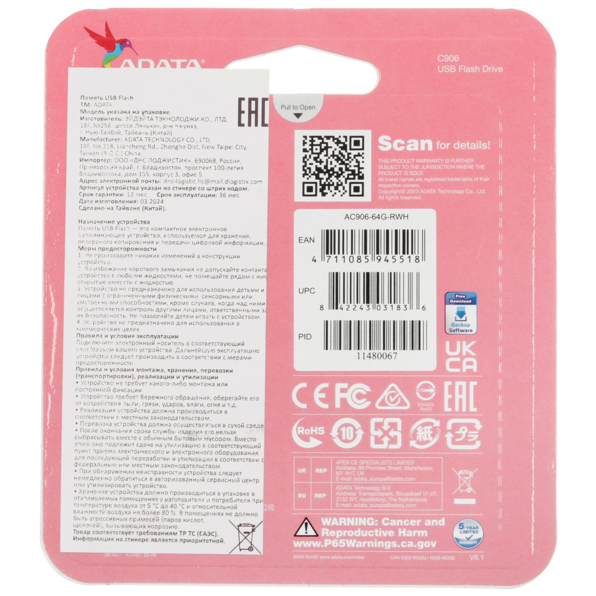 Память USB Flash ADATA C906 имеет объем 64 ГБ, который можно занять нужными и важными файлами. Компактные размеры 58x18x10 мм позволят уместить флешку в любой карман и всегда держать под рукой данные, к которым может потребоваться доступ в любой момент. Память USB Flash ADATA C906 оснащена штекером USB Type-A с поддержкой стандарта USB 2.0, благодаря которому ее можно подключить к большинству компьютеров и ноутбуков для обмена данными. Пластиковый корпус имеет монолитную конструкцию и укомплектован колпачком для защиты интерфейса от механических повреждений.
