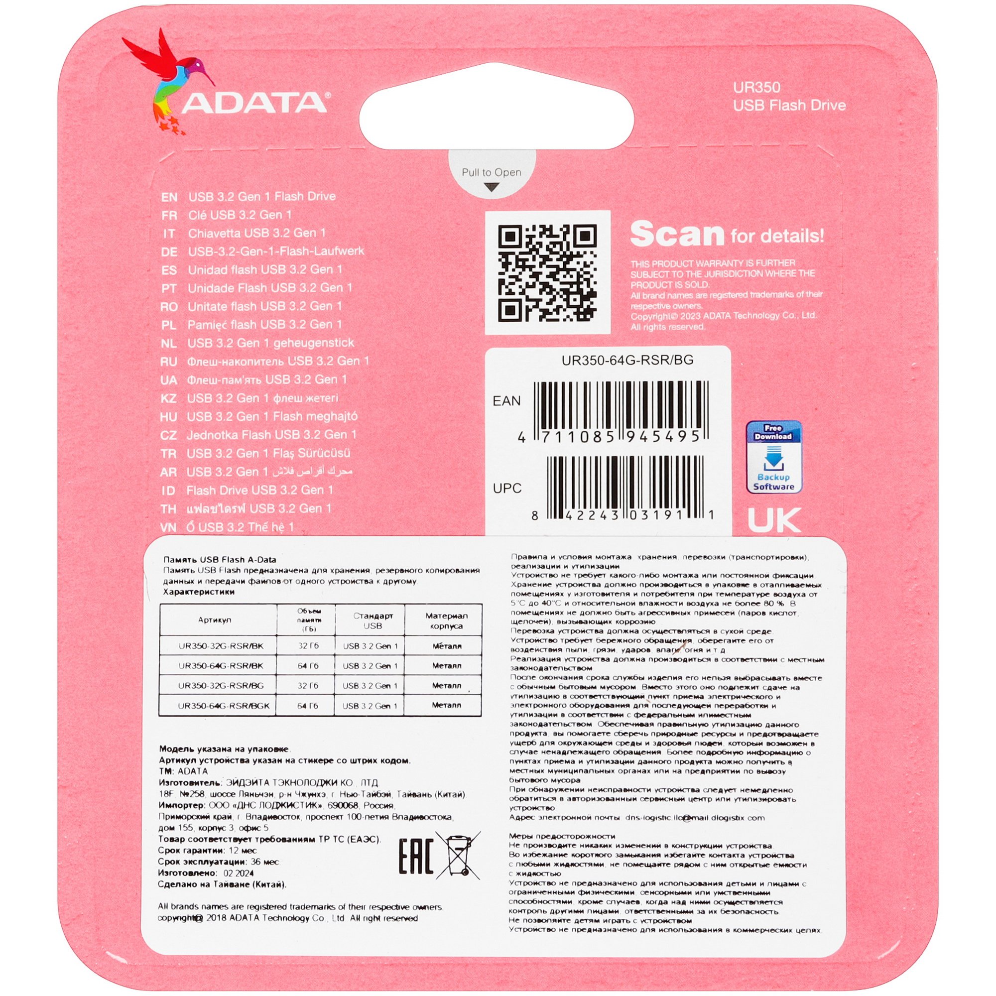 Память USB Flash Adata UR350 поддерживает стандарт подключения USB 3.2 Gen 1, благодаря которому обеспечивается чтение и запись данных на скорости до 5 Гбит/с. Она совместима со всеми операционными системами, что позволяет легко и без лишних действий подключать память к ПК или ноутбуку. Объем накопителя составляет 64 ГБ. На такой флешке удобно хранить коллекцию фильмов, фотографий или музыки.