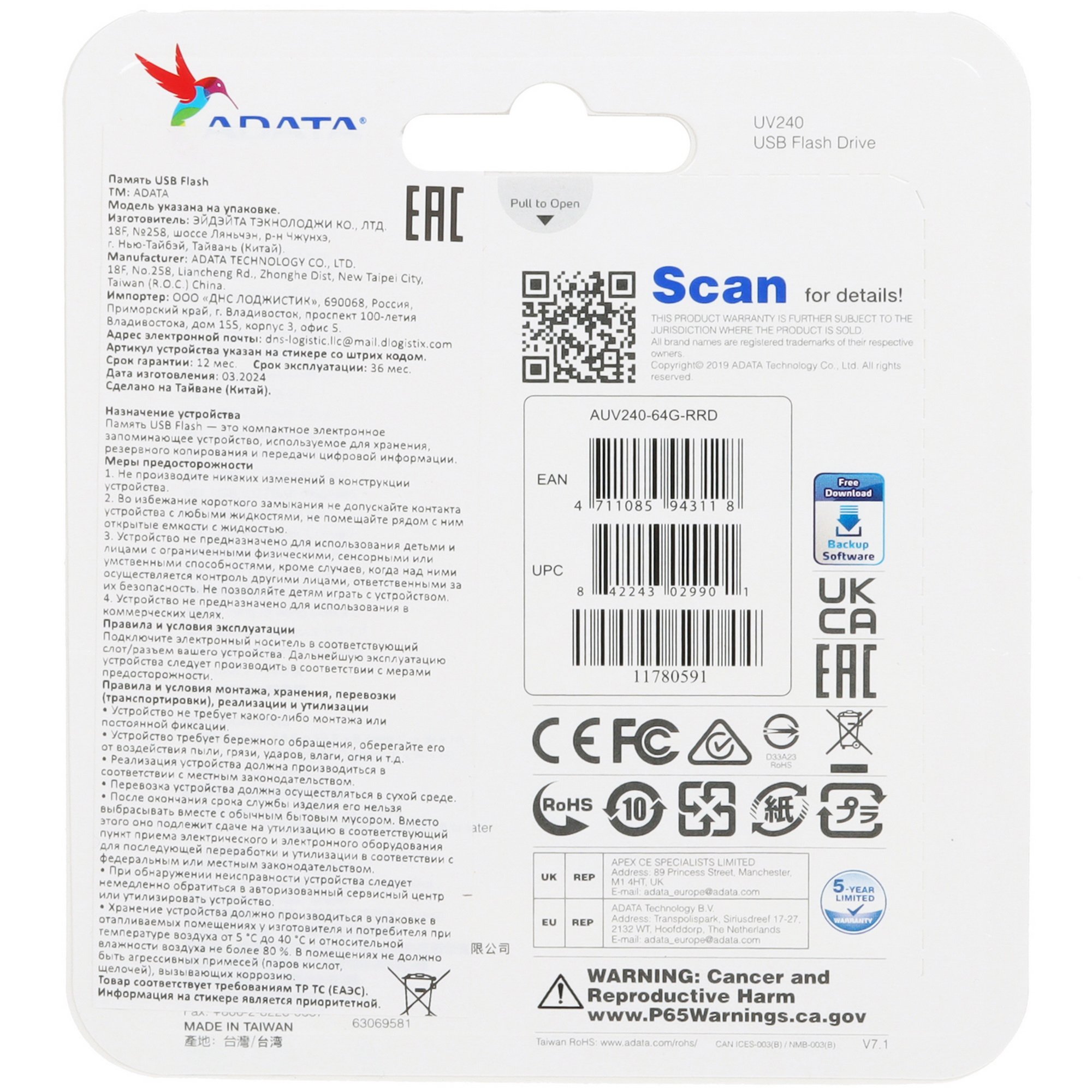 Память USB Flash 64 ГБ ADATA UV240 с поддержкой стандарта USB 2.0 совместима с устаревшими разъемами на разных устройствах. 64 ГБ памяти хватает для скачивания двухчасового 4K-видеоролика или нескольких фильмов в формате Full HD. Накопитель длиной менее 6 см не мешает при ношении в кармане куртки или брюк.