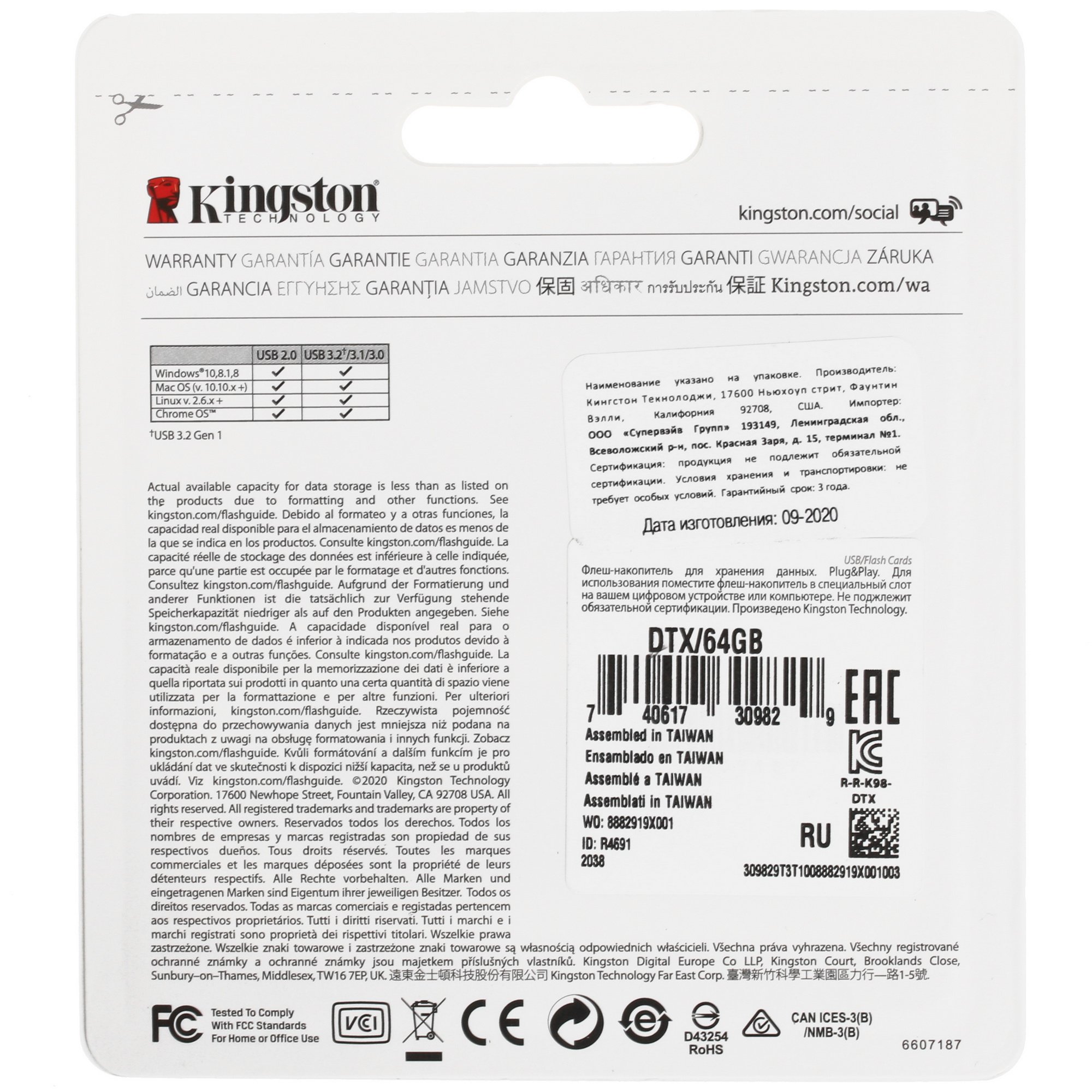 Память USB Flash Kingston DataTraveler Exodia обладает объемом 64 ГБ, что предоставляет возможность хранения весьма большого количества документов, музыки, фото, видео и прочего контента. Интерфейсный разъем USB версии 3.2 Gen 1 обеспечивает высокие показатели быстродействия и простое подключение к настольному компьютеру, ноутбуку, телевизору и другим устройствам с поддержкой соответствующего порта. Накопитель Flash Kingston DataTraveler Exodia выполнен в компактном пластиковом корпусе со съемным защитным колпачком и креплением в виде кольца для простой фиксации на брелке.