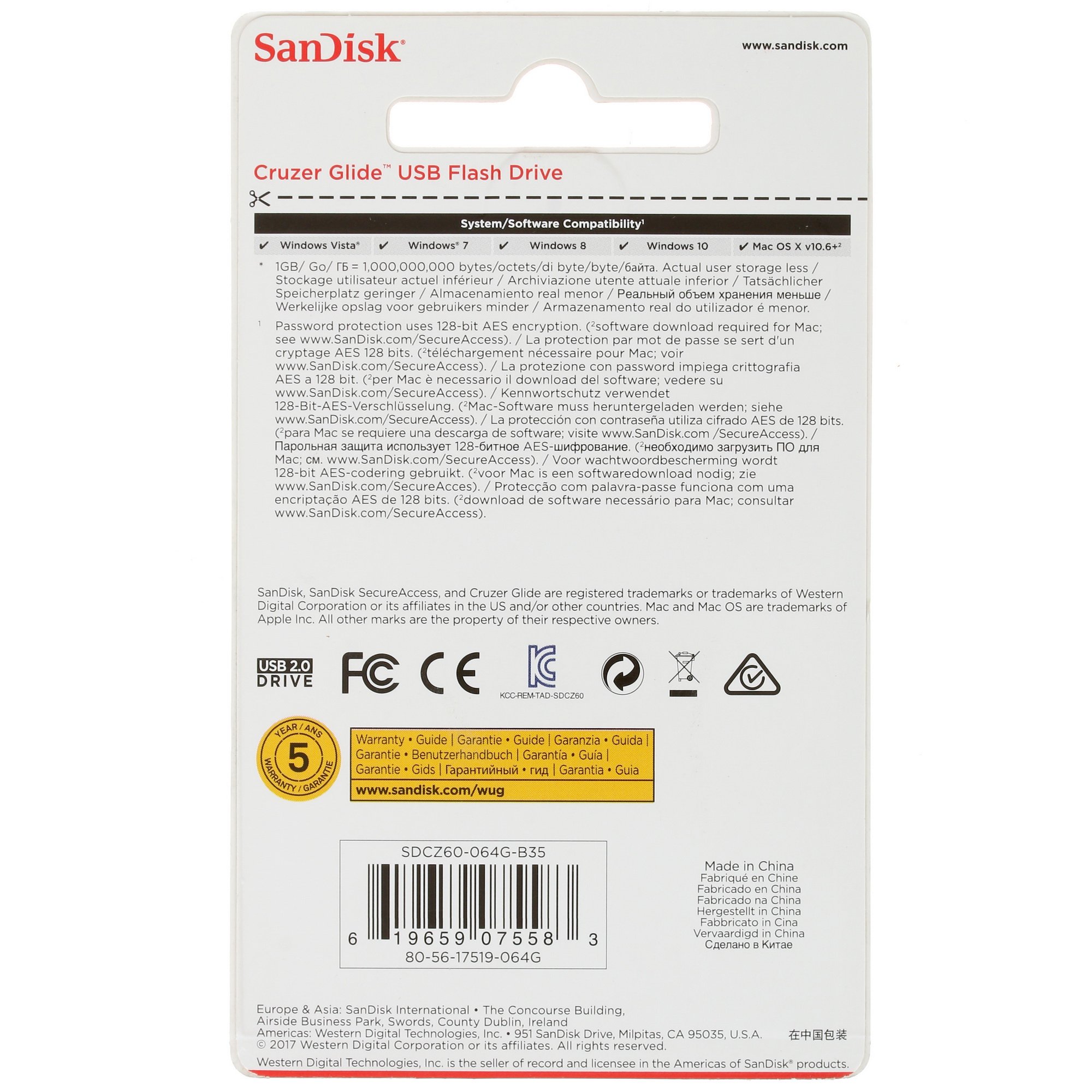 Флешка USB Sandisk 64Gb Cruzer Glide SDCZ60-064G-B35 USB 2.0 черный/красный