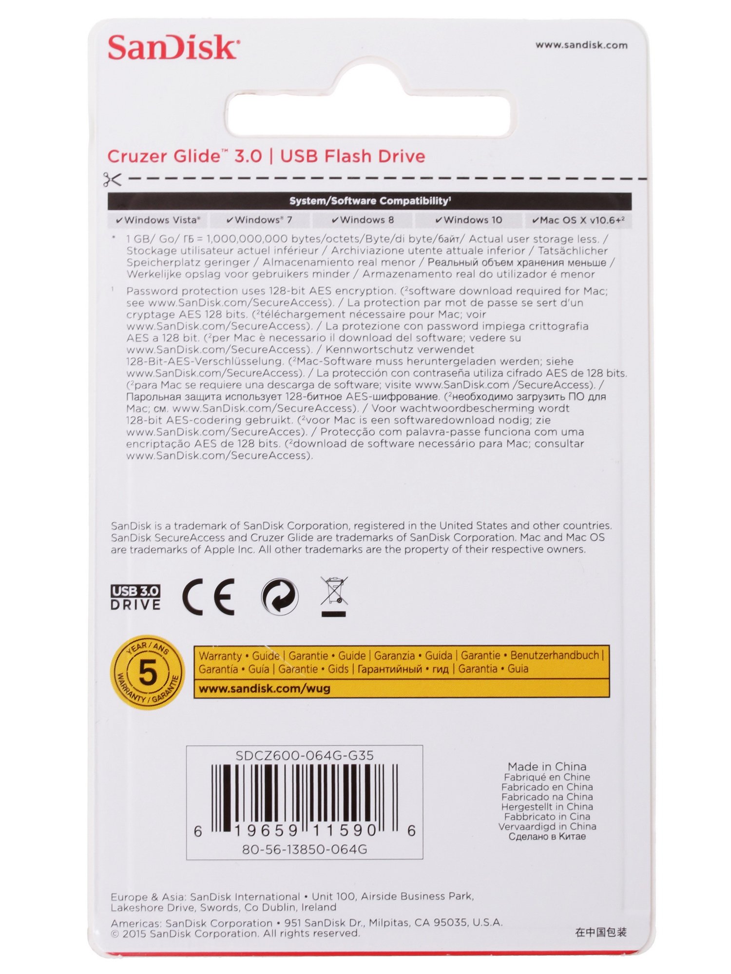 Память USB Flash SanDisk Cruzer Glide имеет внушительный резерв памяти в 64 ГБ. Его хватает для хранения полнометражных кинолент, аудиотек или больших баз данных. Устройство оборудовано универсальным USB-разъемом стандарта 3.0. Эта версия совместима с устройствами с подобными интерфейсами и разъемами версии 1.0.