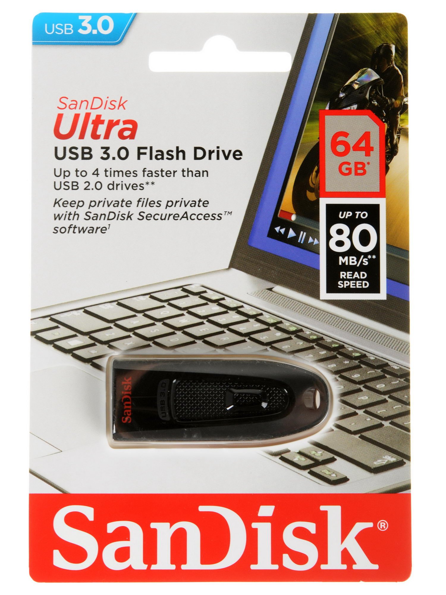 С памятью USB Flash SanDisk Ultra копирование файлов из скучного и довольно нервного занятия превратится в одно короткое мгновение. Отверстие для крепежа обеспечит значительное снижение шансов потерять Ваш накопитель. В случае цейтнота можно использовать способность накопителя проигрывать файлы непосредственно с устройства для передачи данных. Это реализуется благодаря скорости считывания информации, равной 80 мегабайт в секунду.