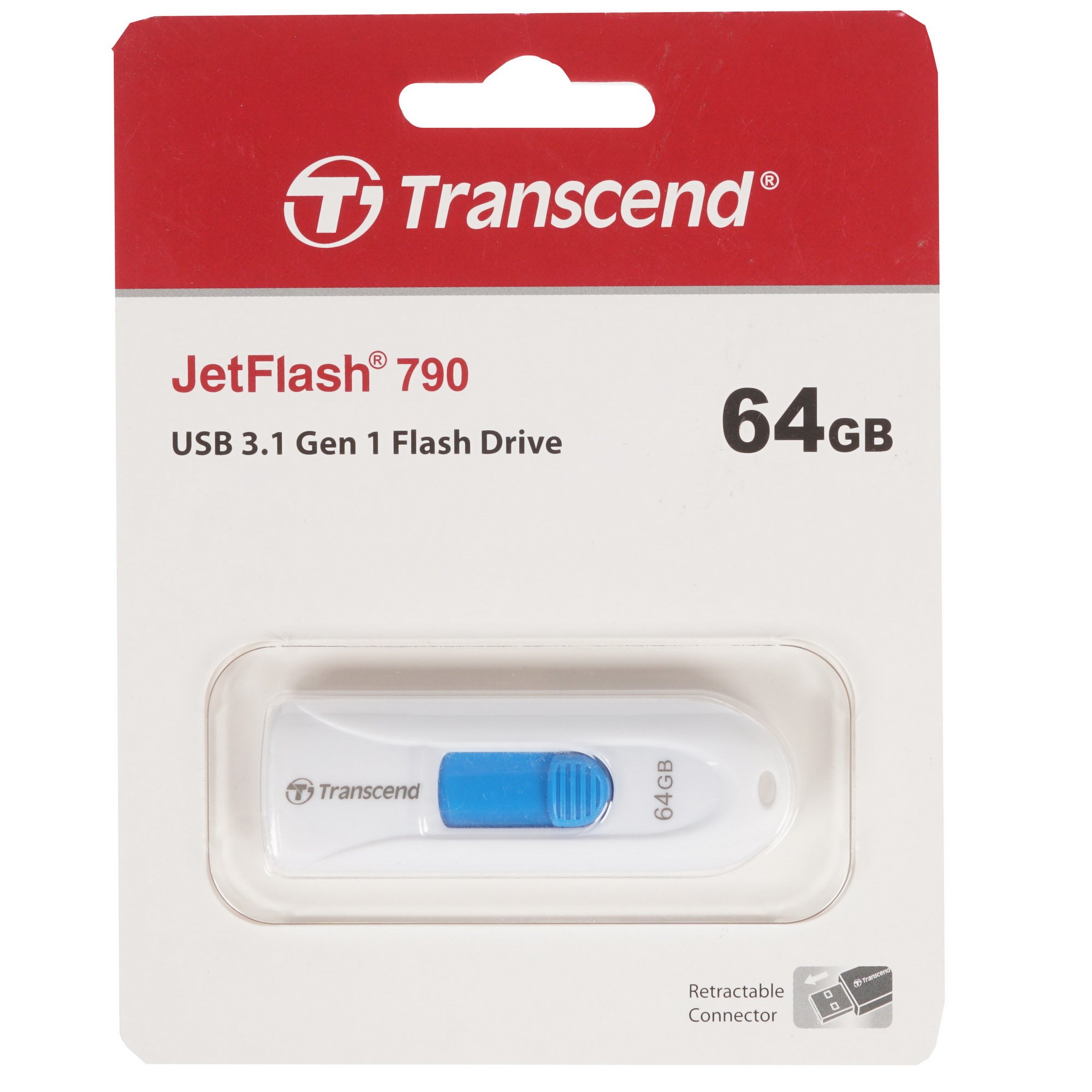 Память USB Flash Transcend JetFlash 790W [TS64GJF790W] имеет оригинальный внешний вид. В дизайне этого флеш-накопителя сочетаются голубой и белый цвета. USB-разъем – выдвижной. Такая конструкция способствует минимизации вероятности физических повреждений. Размеры накопителя – 63.6x21.2x10.6 мм. Масса устройства невелика – лишь 4.9 г.