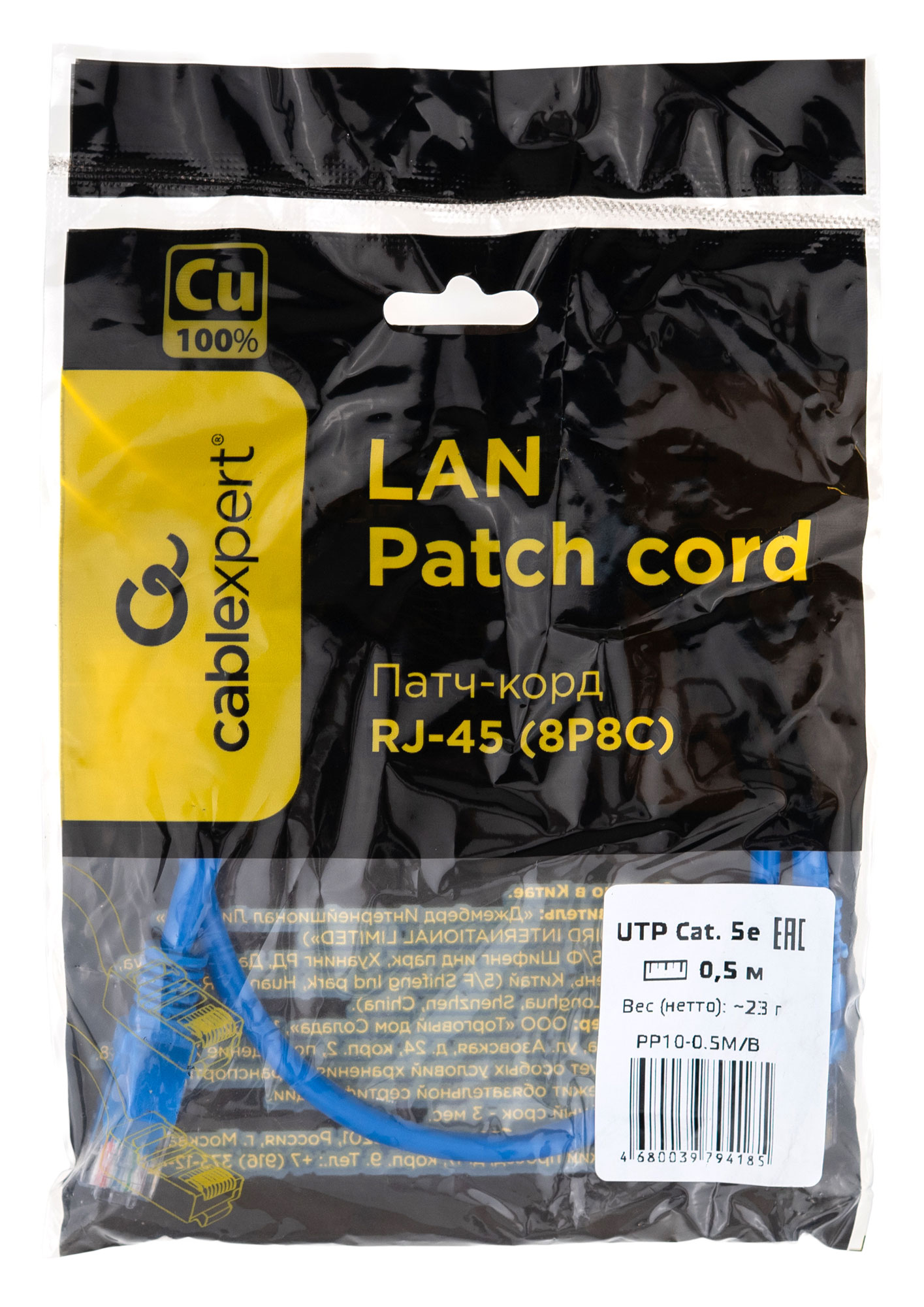 Длина патч-корда Cablexpert PP10-0.5M/B – 50 см. Подключение к активному и пассивному сетевому оборудованию производится с помощью разъемов RJ-45.
