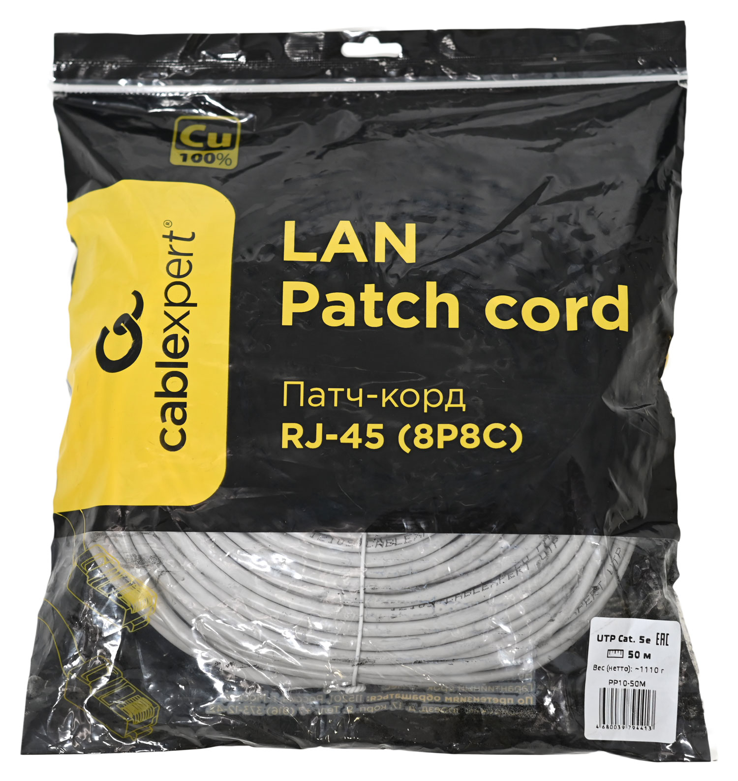 Патч-корд Cablexpert PP10-50M изготовлен с использованием витой пары UTP категории 5e. Максимальная скорость сетевого соединения – 1 Гбит/с. Патч-корд защищен от внешних воздействий изоляцией из ПВХ.