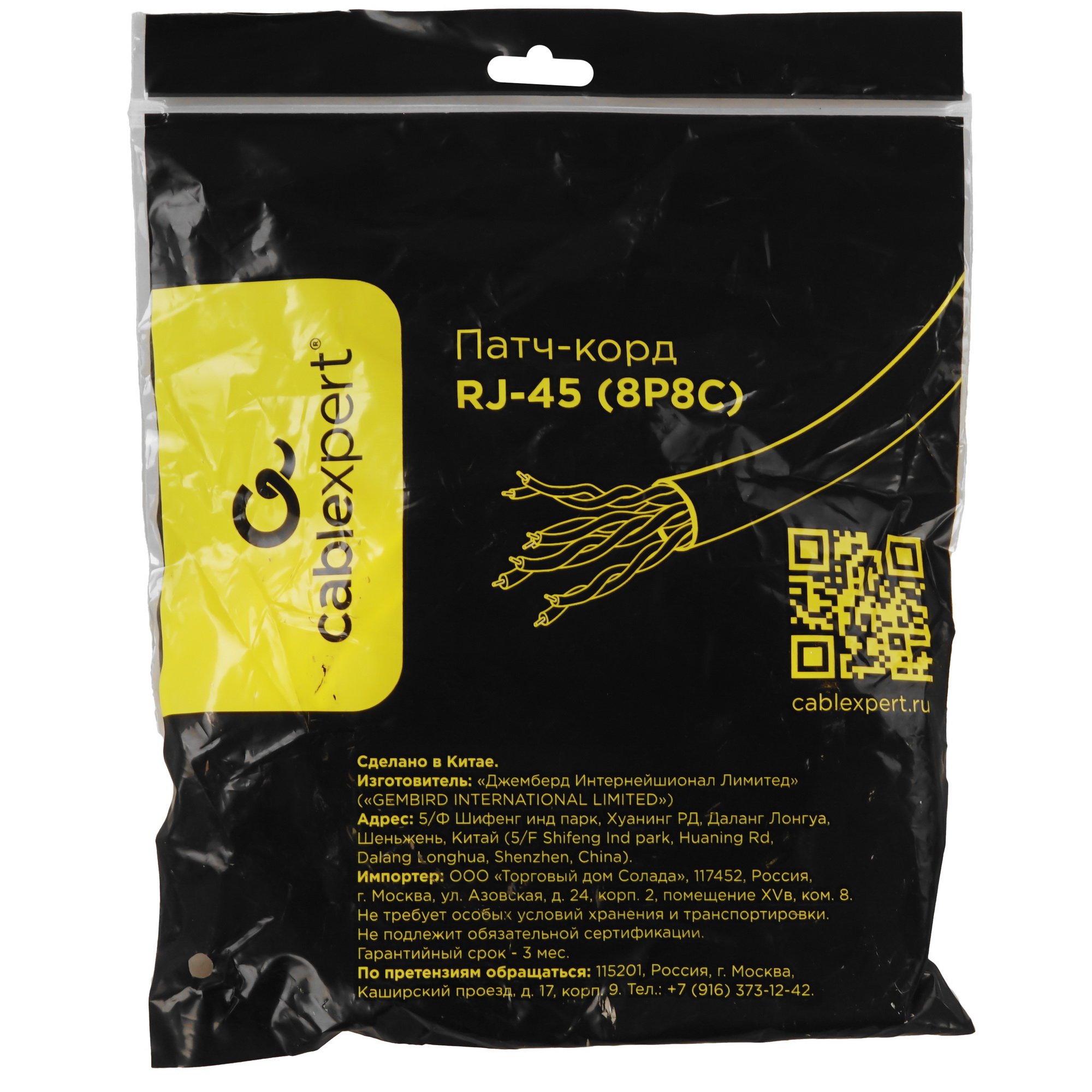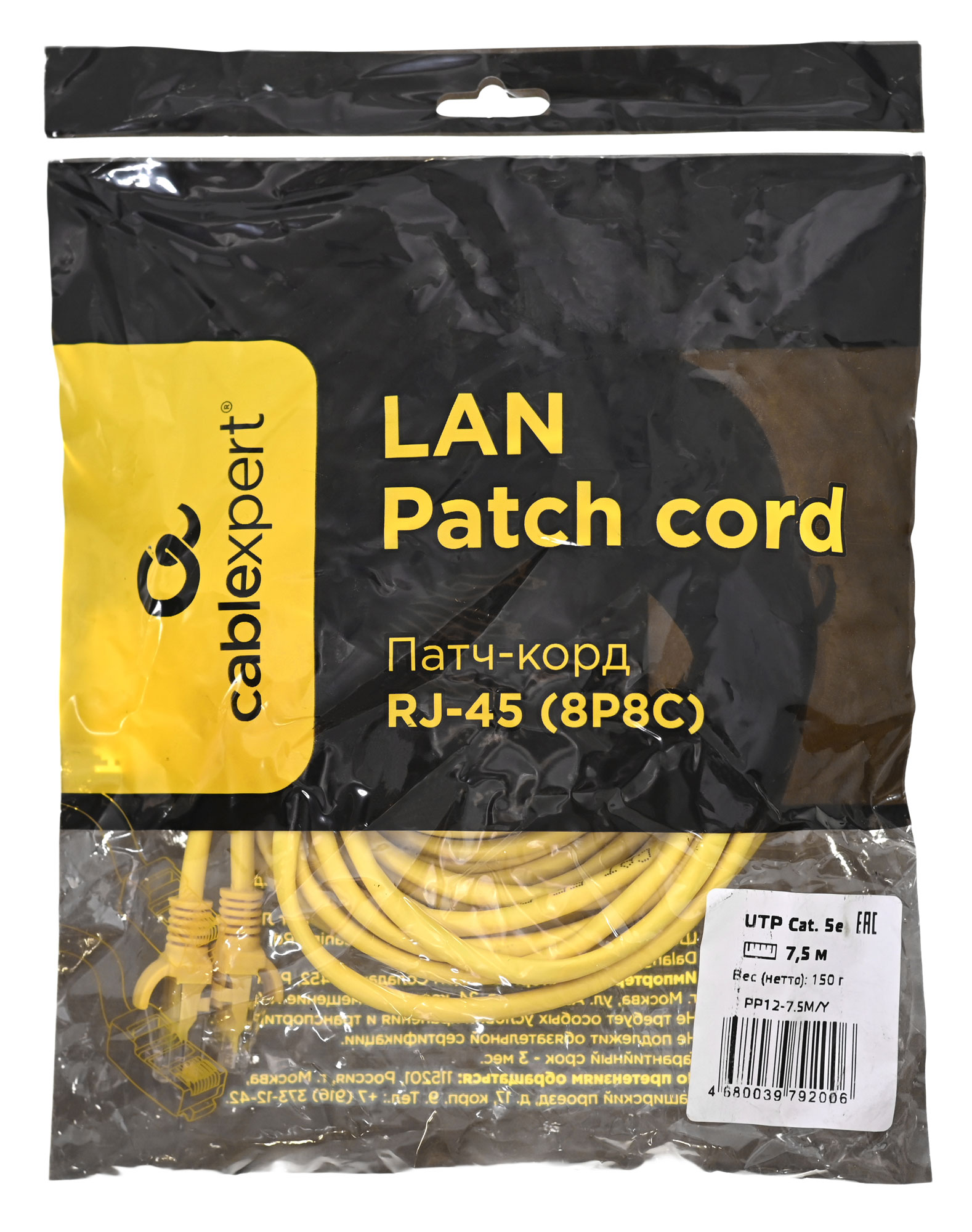 Коннекторы патч-корда Cablexpert PP12-7.5M/Y имеют литое исполнение. Механические повреждения изделия предотвращает внешняя изоляция из поливинилхлорида.