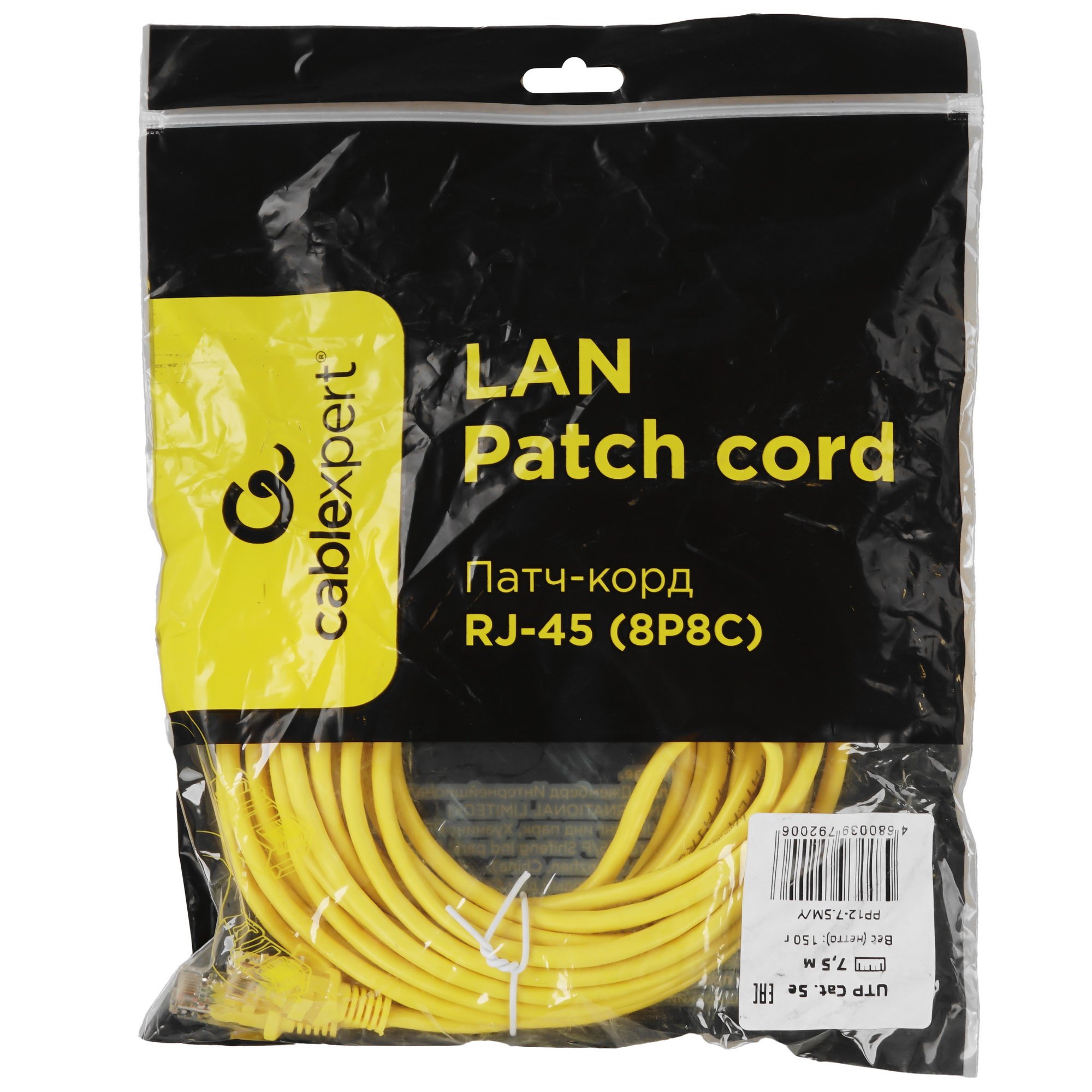 7.5-метровый патч-корд Cablexpert PP12-7.5M/Y желтого цвета с проводниками из омедненного алюминия произведен с использованием витой пары U/UTP категории 5e и рассчитан на скорость сетевого соединения до 1000 Мбит/с. Назначение изделия – подключение компьютеров и другой техники к пассивному сетевому оборудованию или связь сетевых устройств между собой.