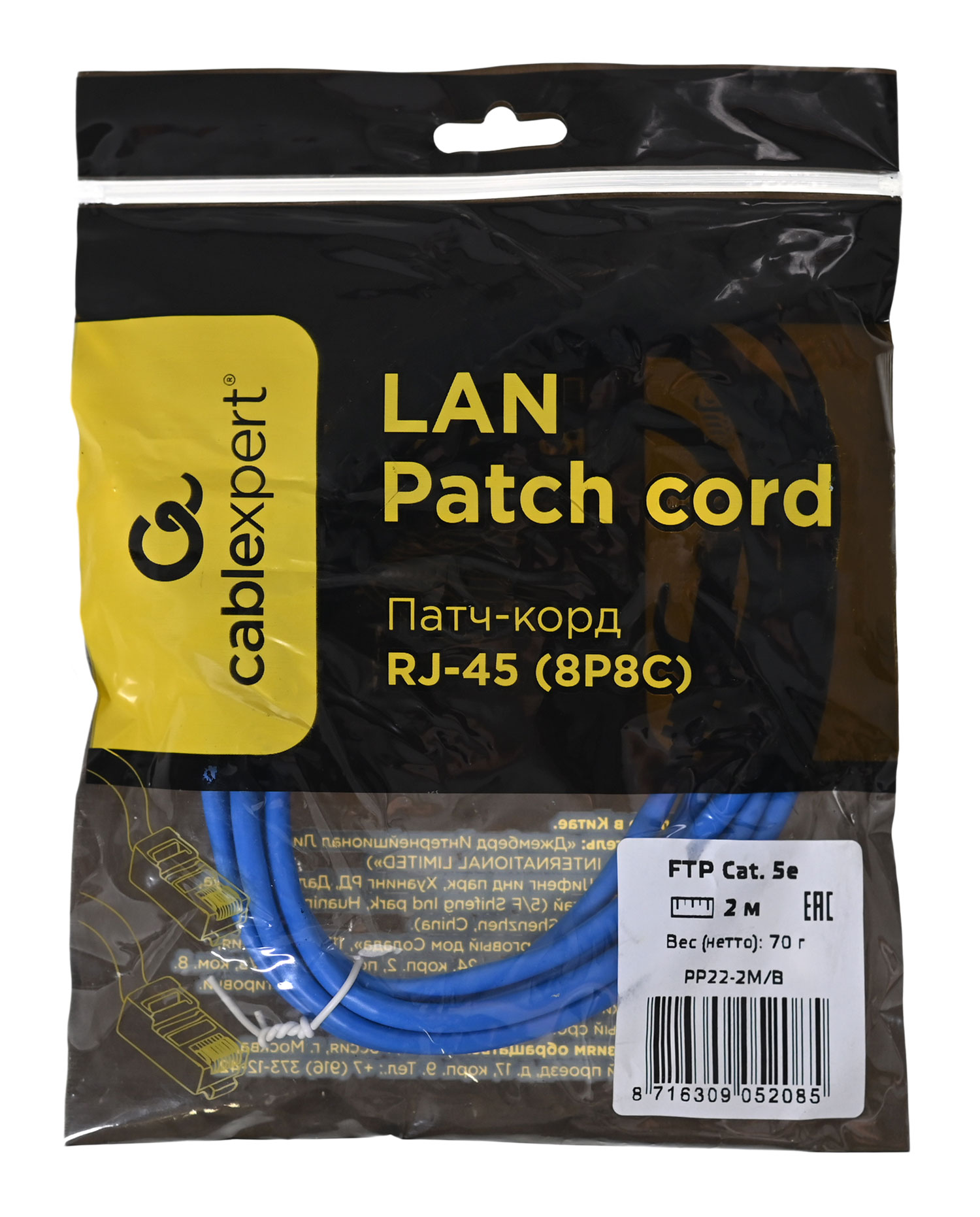 Патч-корд Cablexpert PP22-2M/B синего цвета с проводниками из омедненного алюминия произведен с использованием витой пары F/FTP категории 5e и поддерживает скорость сетевого соединения до 1000 Мбит/с. Экранирование из фольги предотвращает влияние электромагнитных помех на передачу сигнала. Патч-корд предназначен для подключения компьютеров и другой техники к пассивному сетевому оборудованию и для соединения сетевых устройств друг с другом. В изделии реализованы экранированные литые разъемы RJ-45.