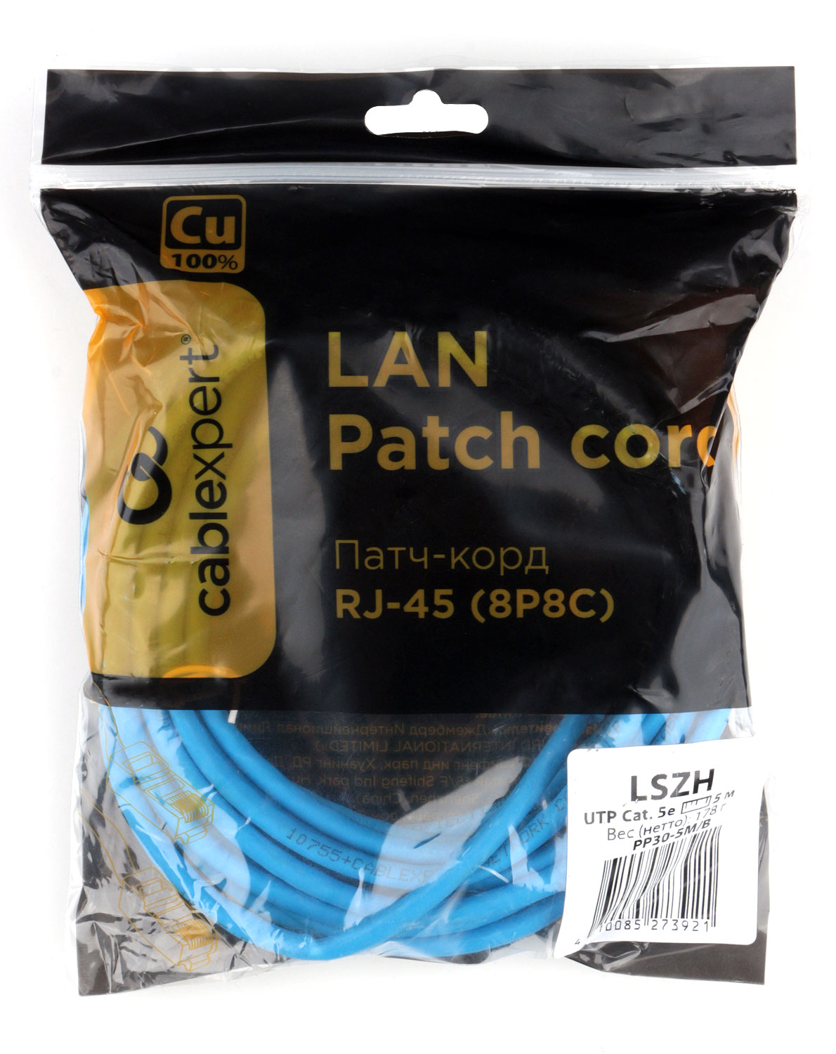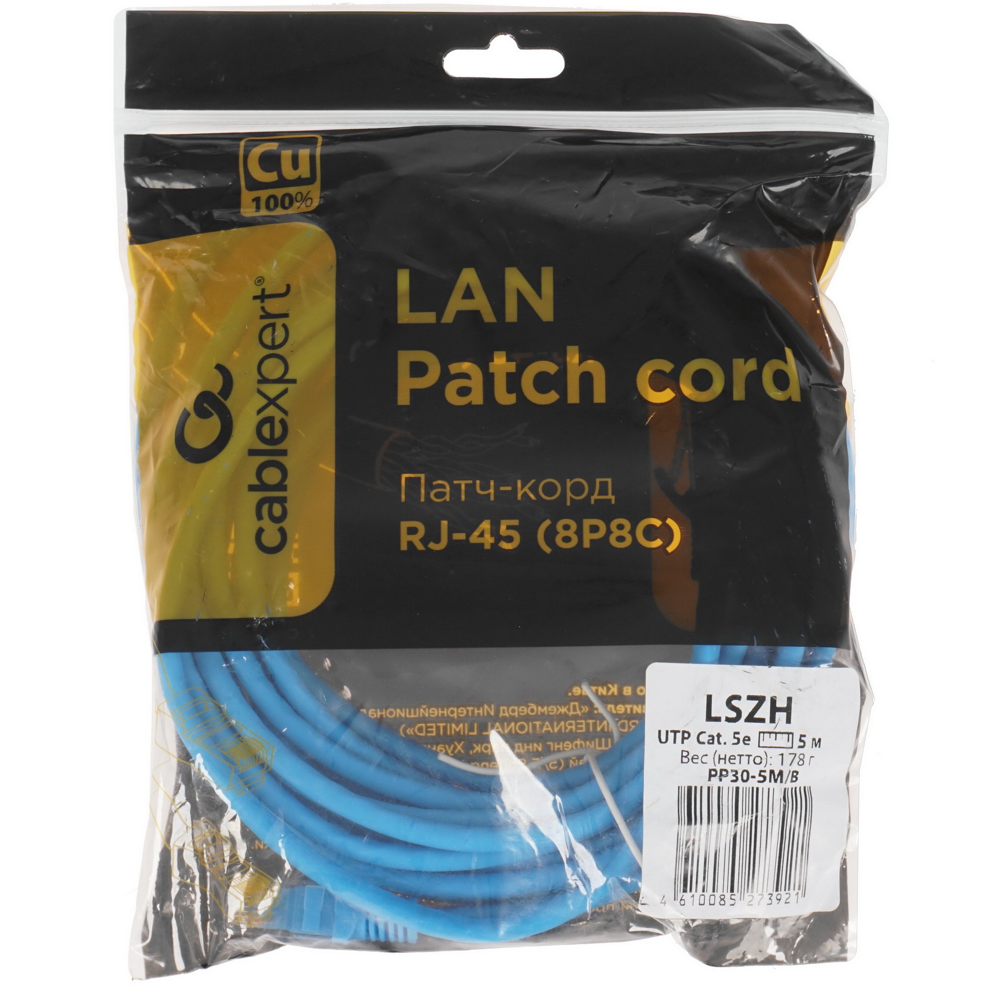 Патч-корд LSZH медный UTP Cablexpert PP30-5M/B кат.5e, 5м, литой, многожильный, синий