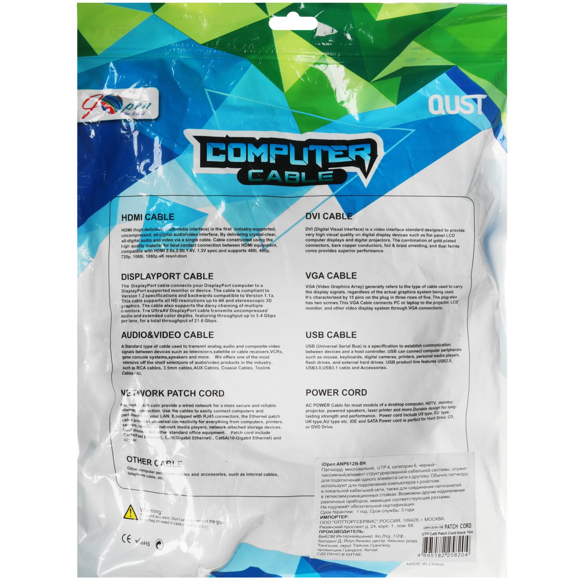 Патч-корд литой AOpen ANP612B-BK-15M (7/0.20) UTP кат.6 черный 15m