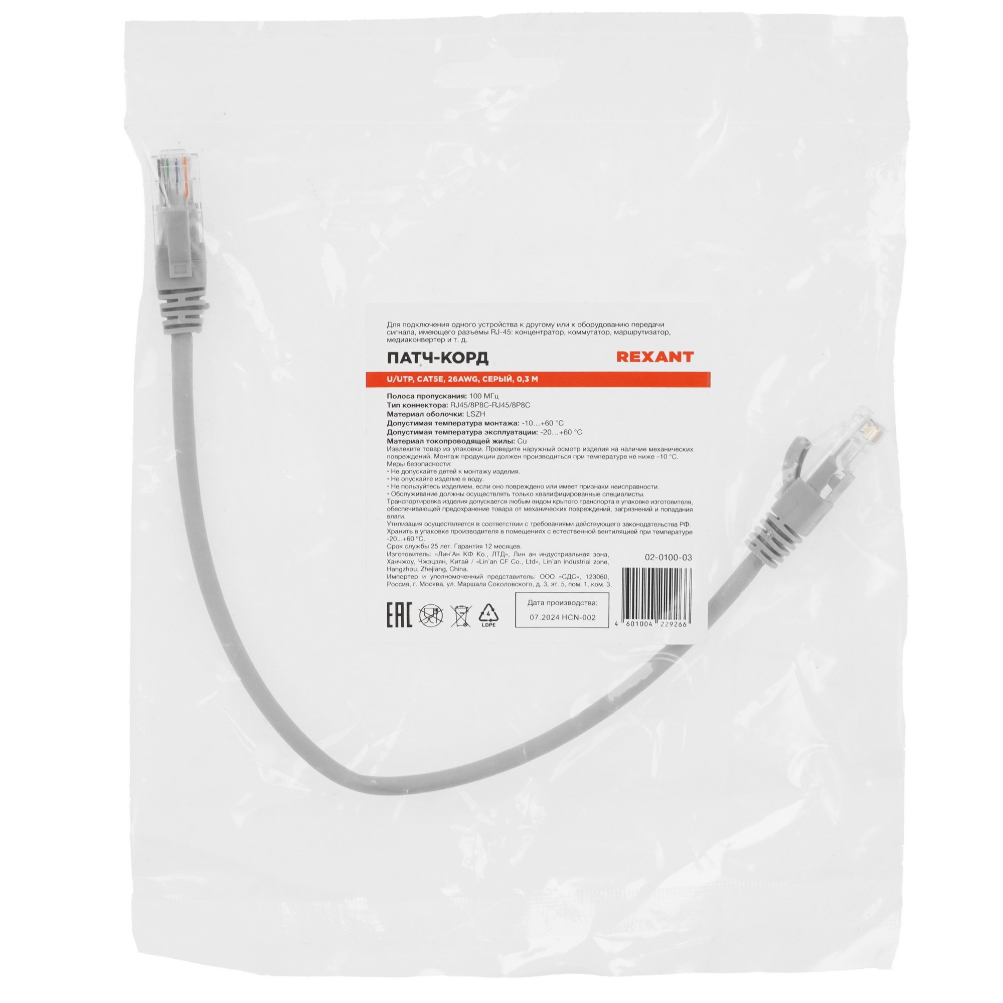 Медный патч-корд Rexant 02-0100-03 серого цвета произведен с использованием витой пары U/UTP категории 5e и поддерживает скорость передачи данных до 1000 Мбит/с. Длина изделия – 0.3 м. Кабель рассчитан на подключение компьютеров и другой техники к пассивному сетевому оборудованию и соединение сетевых устройств между собой.