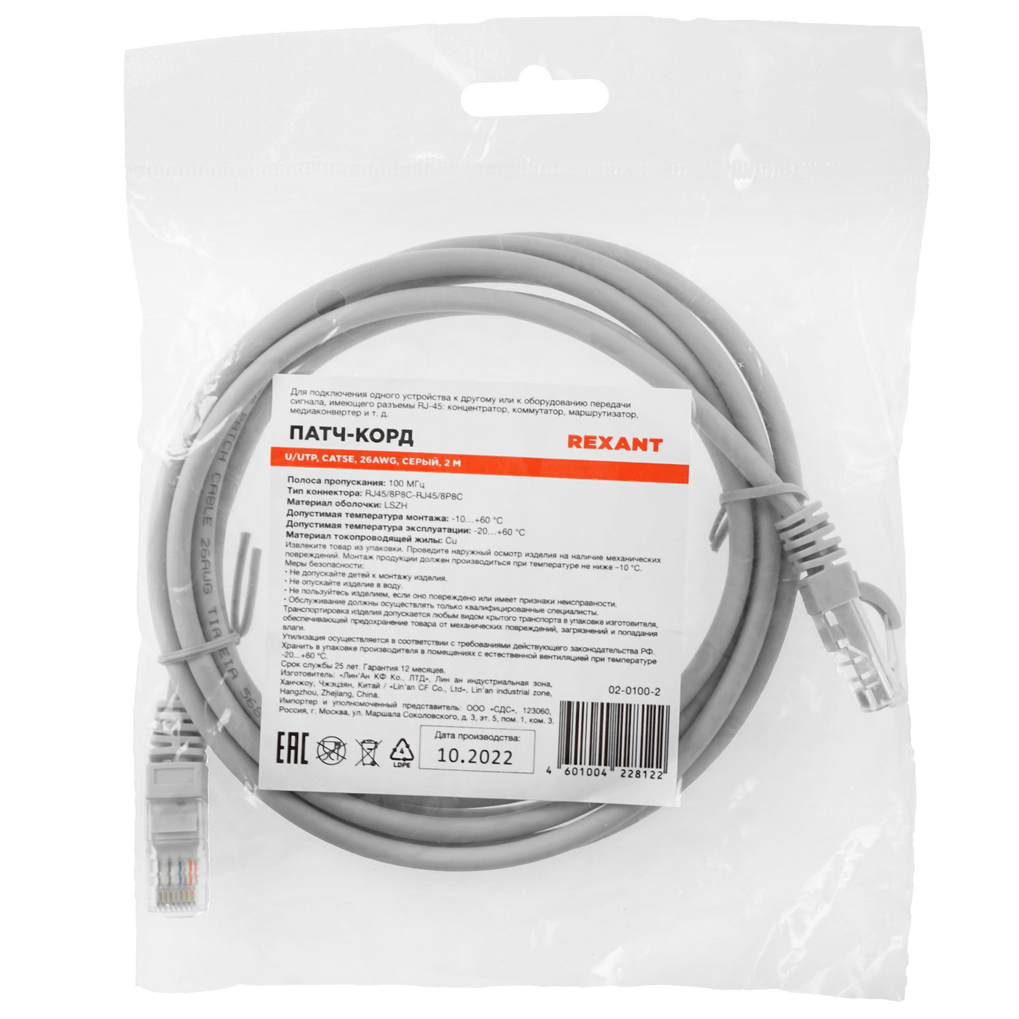 Патч-корд Rexant U/UTP, CAT 5e, RJ45-RJ45, 26AWG, ZH нг(А)-HF, серый, 2м