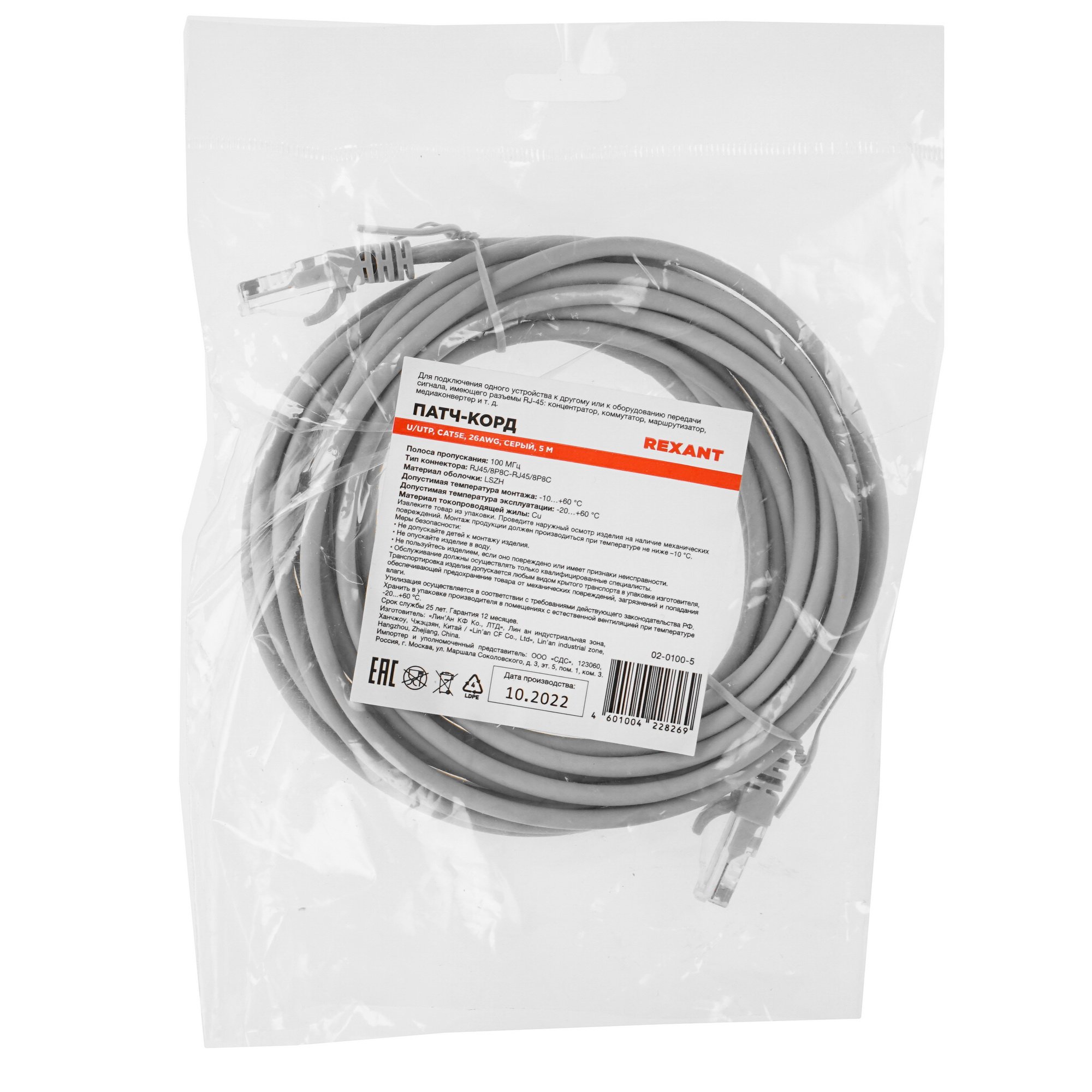 Медный патч-корд Rexant 02-0100-5 серого цвета произведен с использованием витой пары U/UTP категории 5e и поддерживает скорость передачи данных до 1000 Мбит/с. Длина изделия – 5 м. Кабель рассчитан на подключение компьютеров и другой техники к пассивному сетевому оборудованию и соединение сетевых устройств между собой.