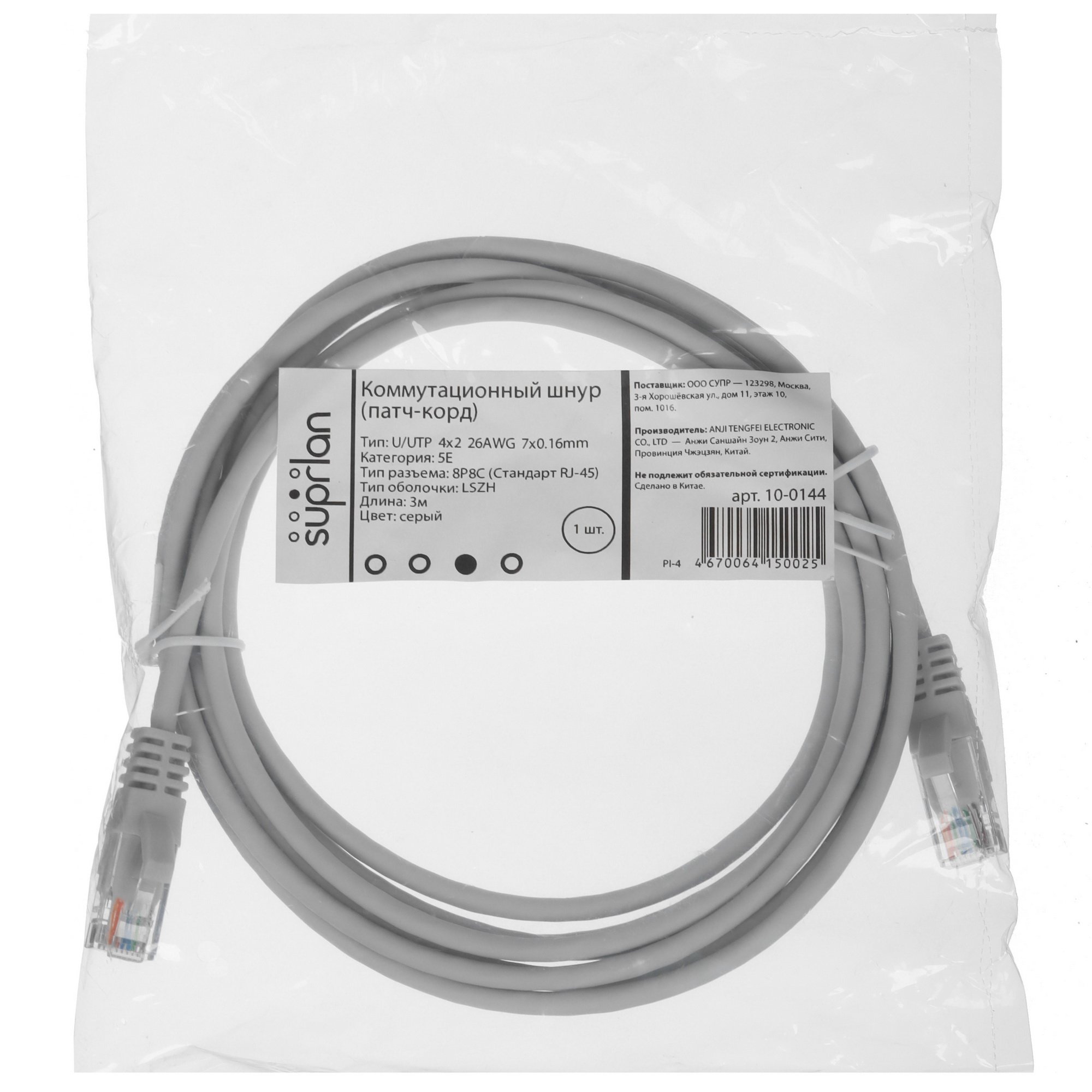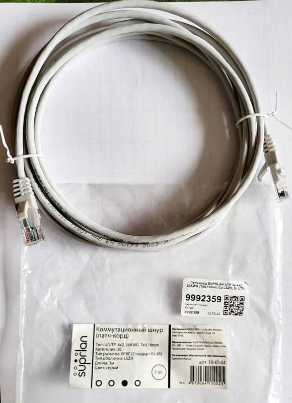 Патч-корд SUPRLAN 10-0144 имеет длину 3 м. Материал проводника – медь.