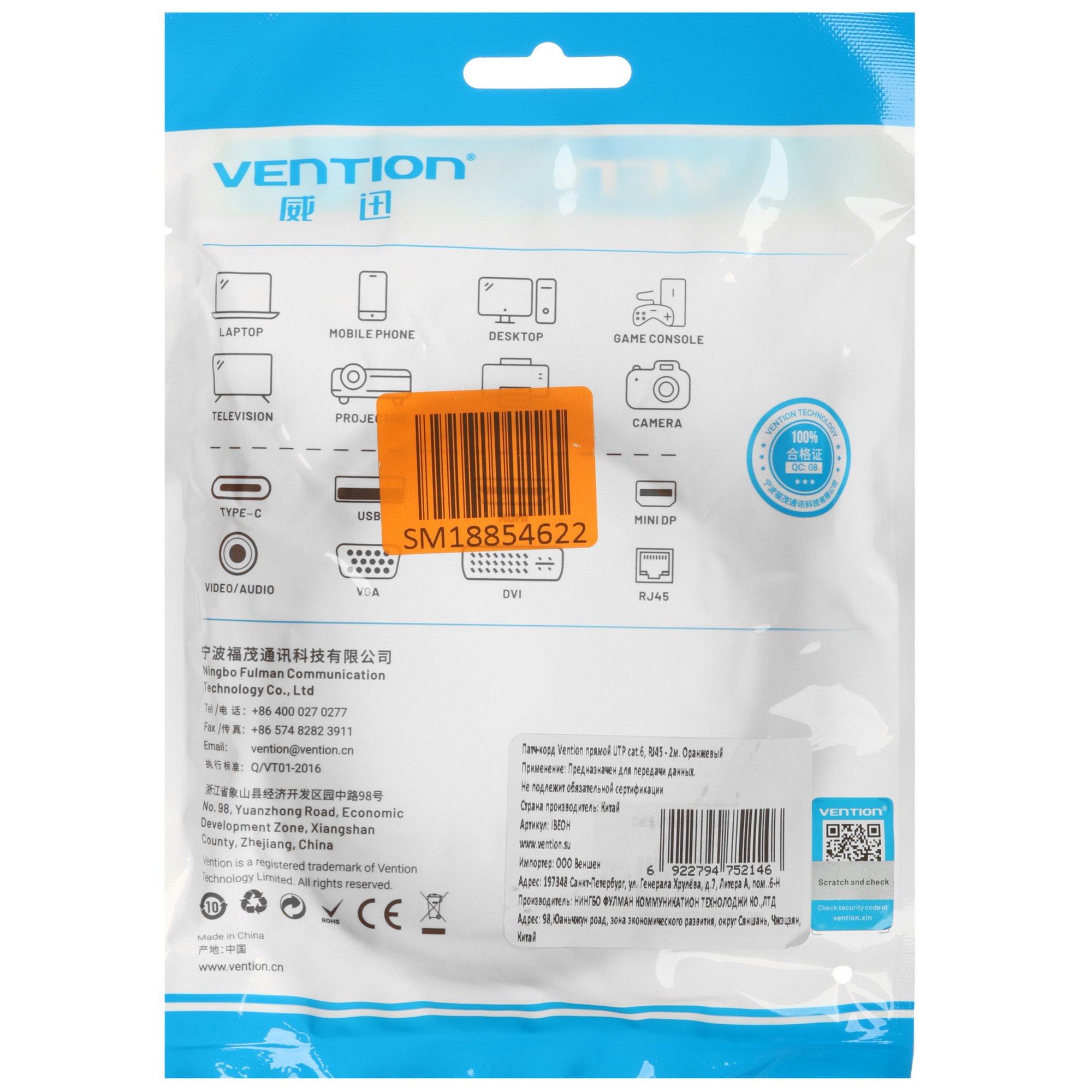 Длина патч-корда Vention IBEOH – 2 м. Защиту изделия от внешних воздействий обеспечивает изоляция из поливинилхлорида.