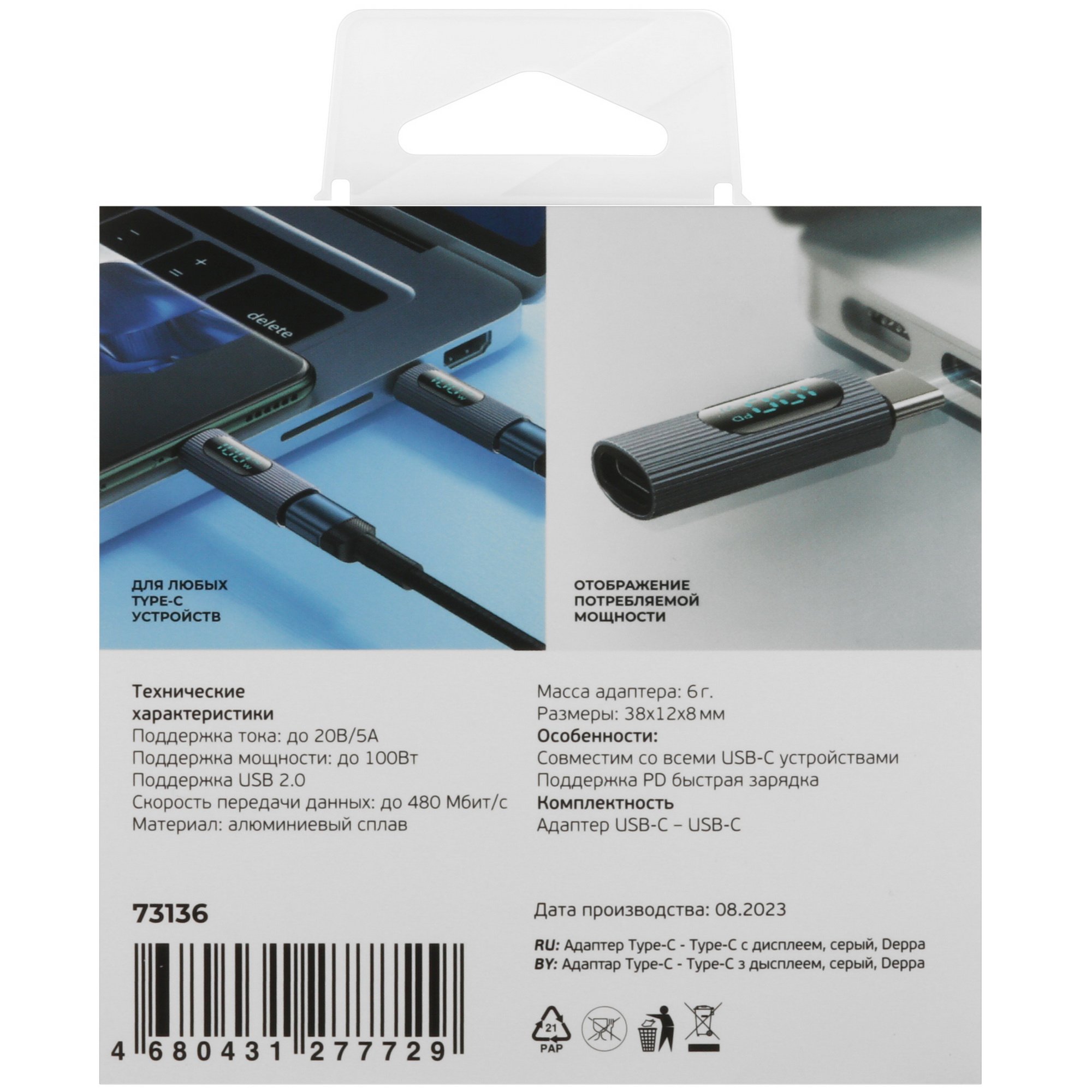 Адаптер Deppa Type-C - Type-C с дисплеем подходит для зарядки и передачи данных между устройствами. Металлические корпусы разъемов гарантируют плотное прилегание и надежную защиту от повреждений. Дисплей показывает текущую мощность с предельным значением 100 Вт.