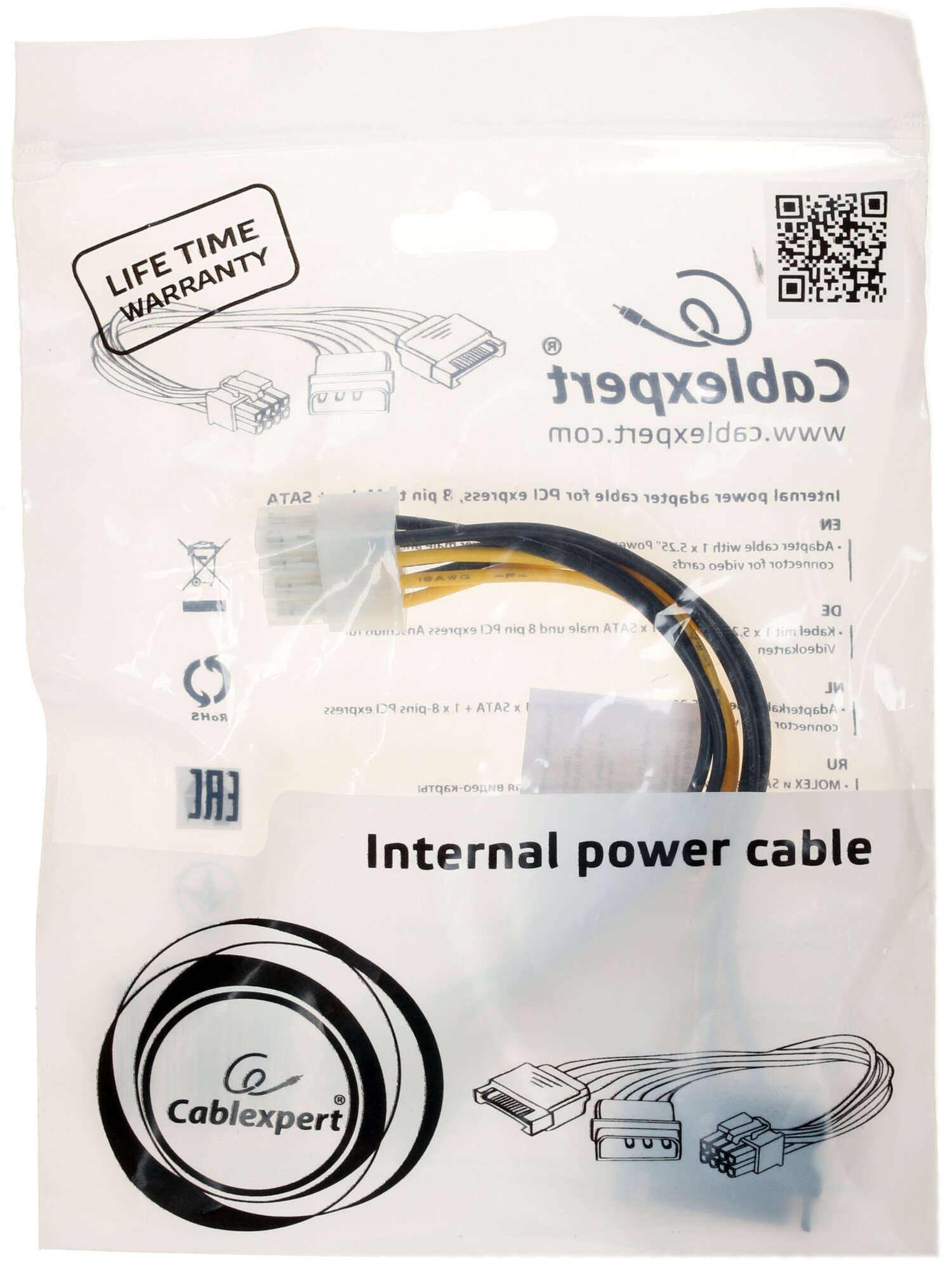 Переходник-разветвитель Cablexpert Molex - 8-pin с кабелем длиной 150 мм является практичным решением для обеспечения питания видеокарты. Заинтересованным пользователям ПК он предлагается в тонкой полупрозрачной упаковке из полиэтилена.