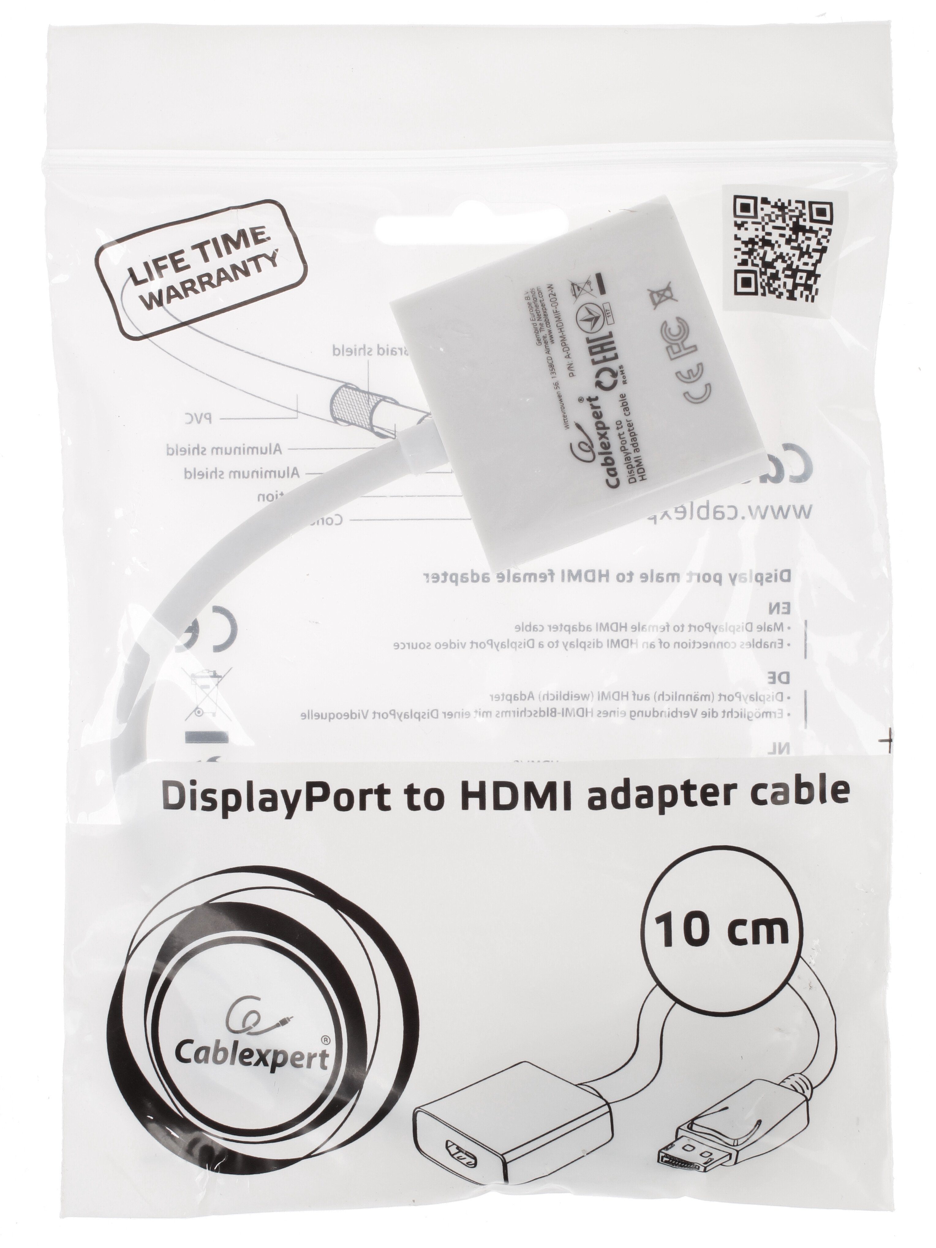 Выполнен переходник Cablexpert DisplayPort - HDMI в белом цвете. Вам понравится простой дизайн данной модели. Разъемы соединены через кабель. Он обладает длиной 10 см и используется для передачи сигнала.