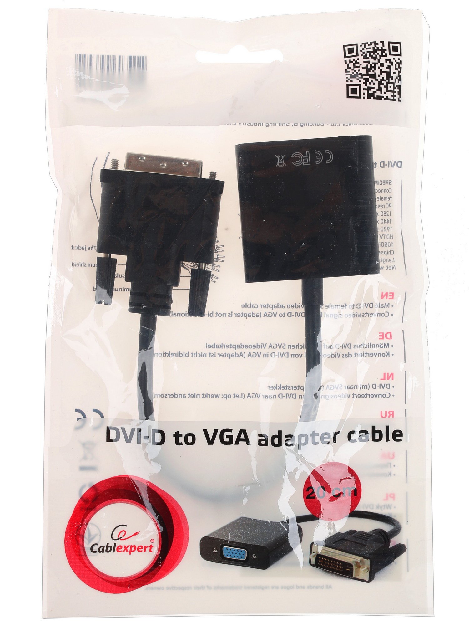 Переходник DVI-D-VGA Cablexpert A-DVID-VGAF-01, 25M/15F, длина кабеля 0,2м, черный, пакет