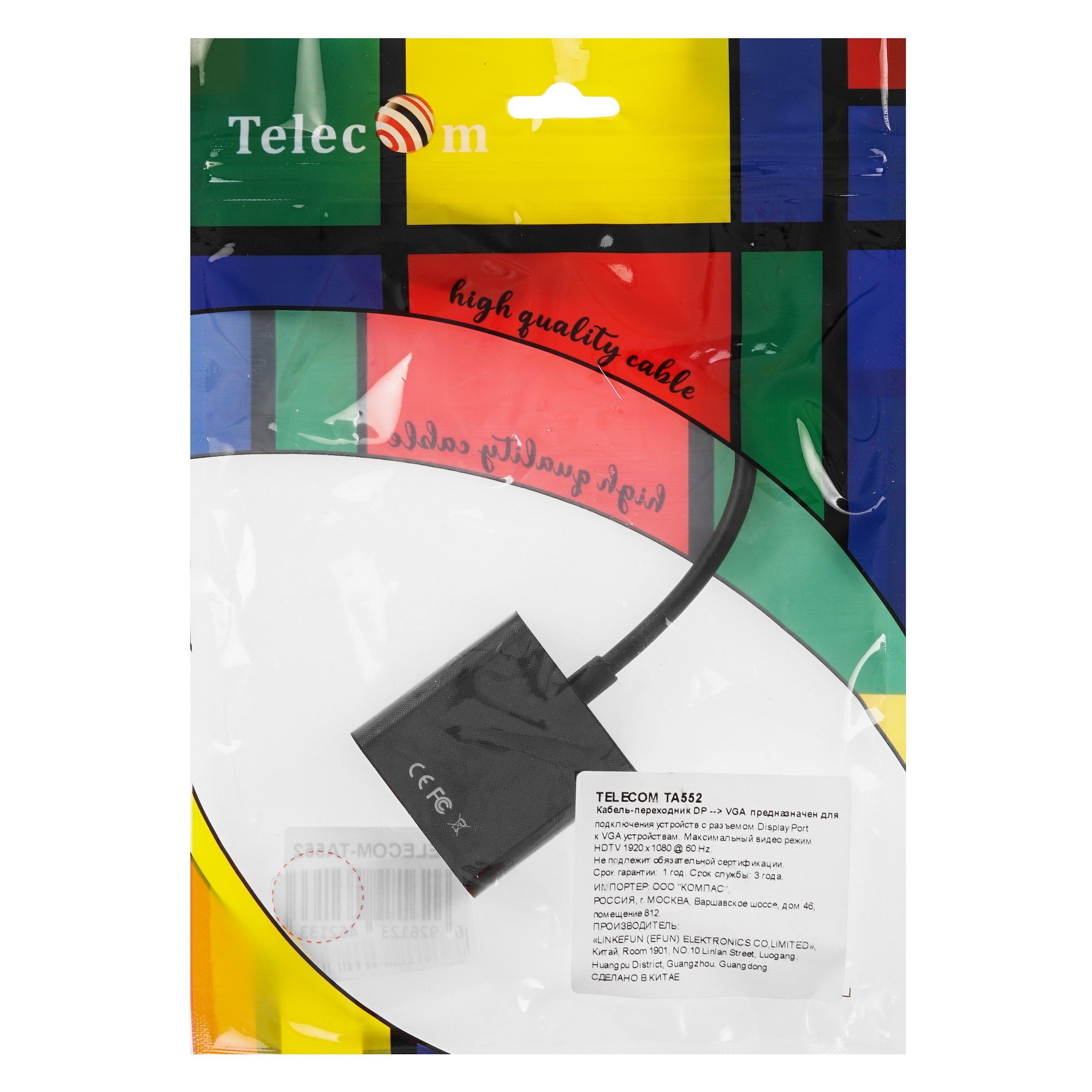 Переходник однонаправленный Telecom DisplayPort - VGA оснащен разъемами вилка и розетка. Источник сигнала – DisplayPort. Длина кабеля переходника равна 20 см.