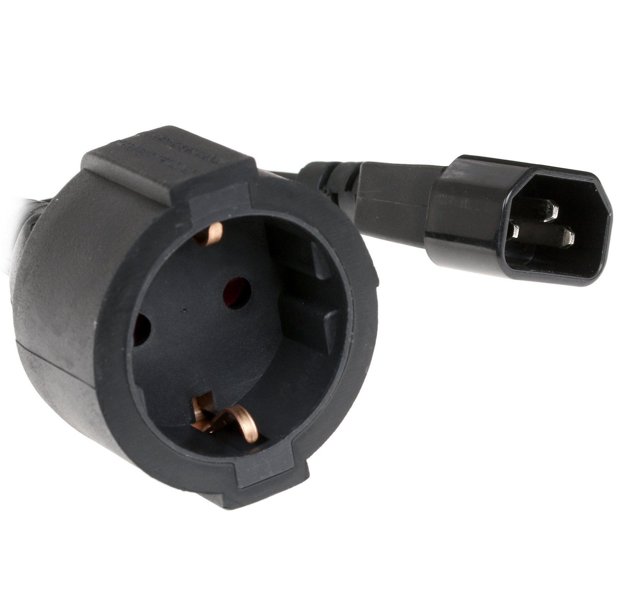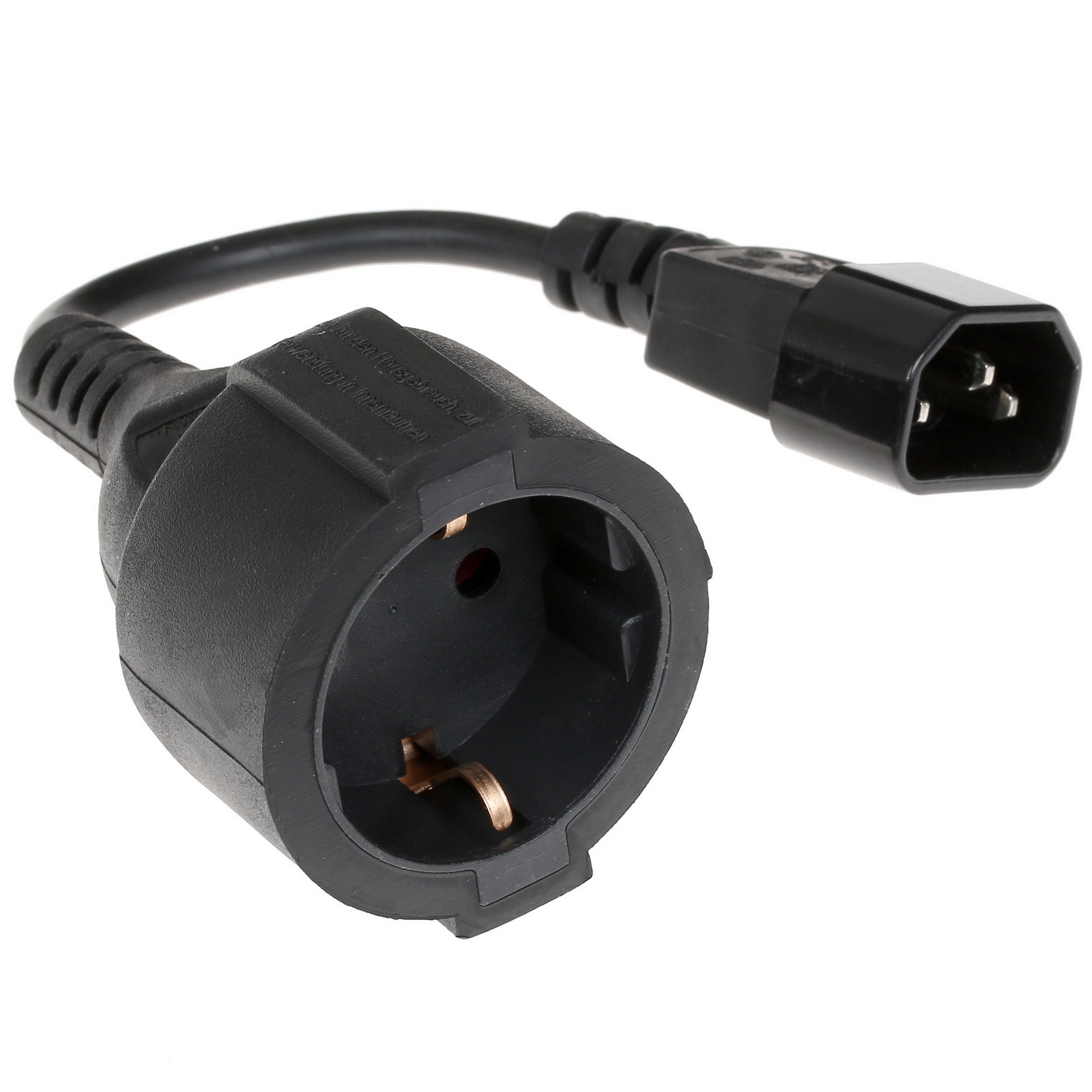 Переходник Cablexpert PC-SFC14M-01 черного цвета, предназначенный для индивидуального блока питания, обладает компактными размерами и практически не занимает места при использовании. При этом аксессуар имеет входную вилку IEC C14 (компьютерная) и евророзетку на выходе. Модель выдерживает максимальный ток нагрузки до 10 А. Длина кабеля переходника Cablexpert PC-SFC14M-01 составляет 15 см. Аксессуар позволяет поддерживать работоспособность ИБП. Он не имеет предохранителей и защиты от радиочастотных шумов.