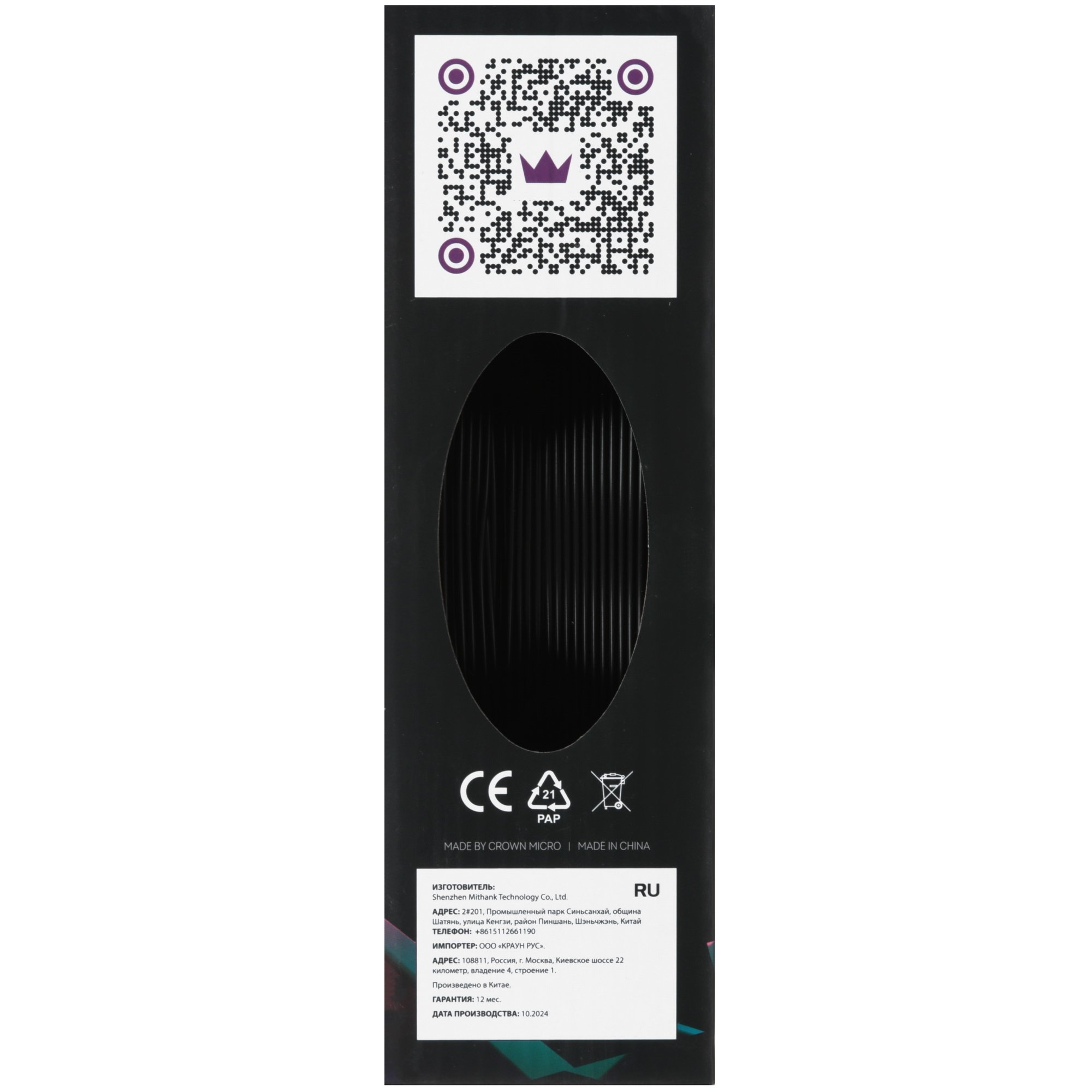Цвет пластика CROWN CM-FILPLA002B – черный. Толщина нити составляет 1.75 мм, а длина – 330 м.
