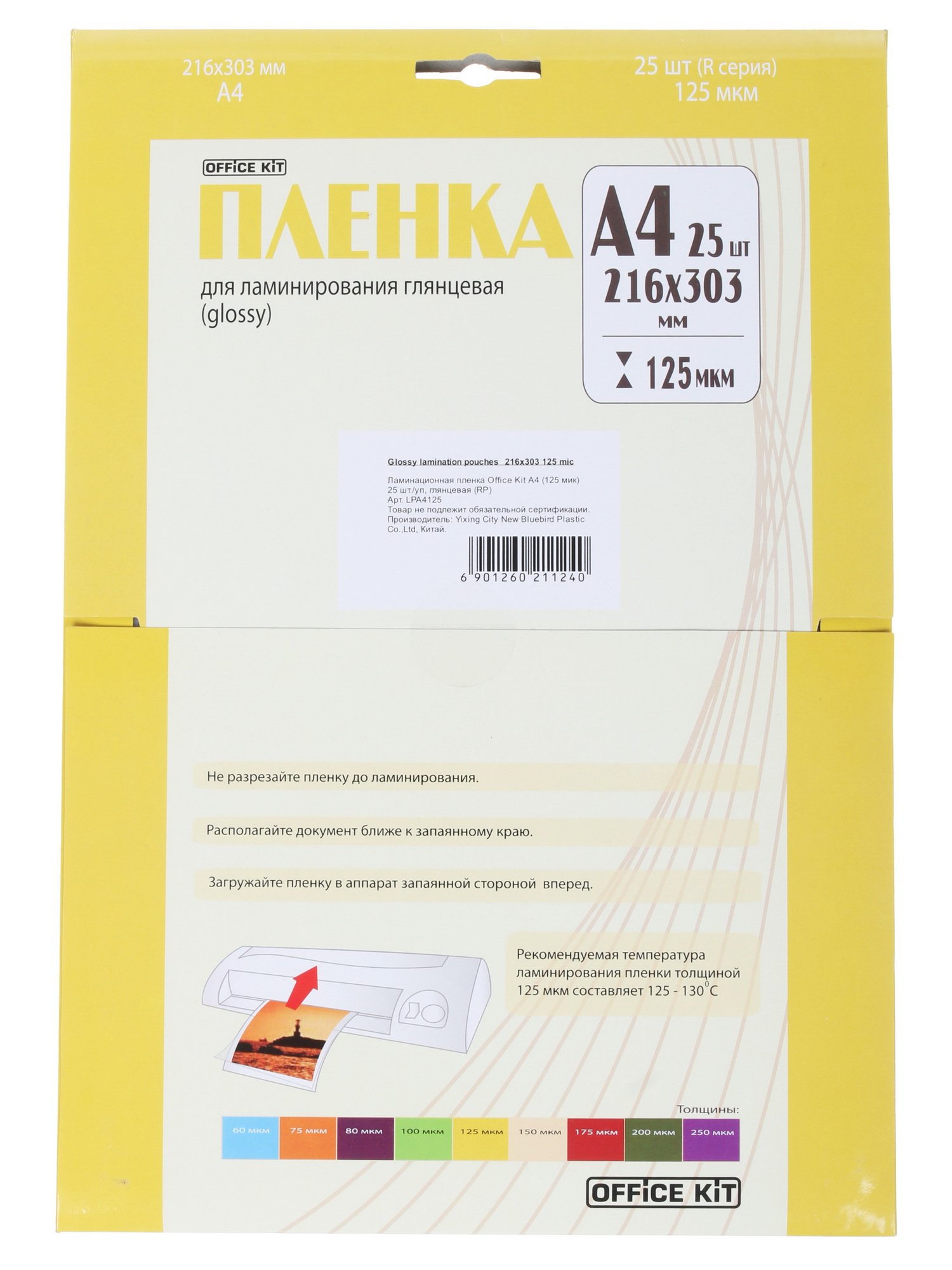 Пленка для ламинирования Office Kit LPA4125 пользуется большой популярностью среди многочисленных пользователей за счет своего формата - 216x303 мм. Благодаря ему представленную модель можно использовать для ламинирования документов формата A4, являющимся наиболее распространенным в области документооборота. Комплект поставки состоит из 25 одинаковых пленок с глянцевым покрытием. Размеры упаковки - 240x350x10 мм, вес равен 0.5 кг.