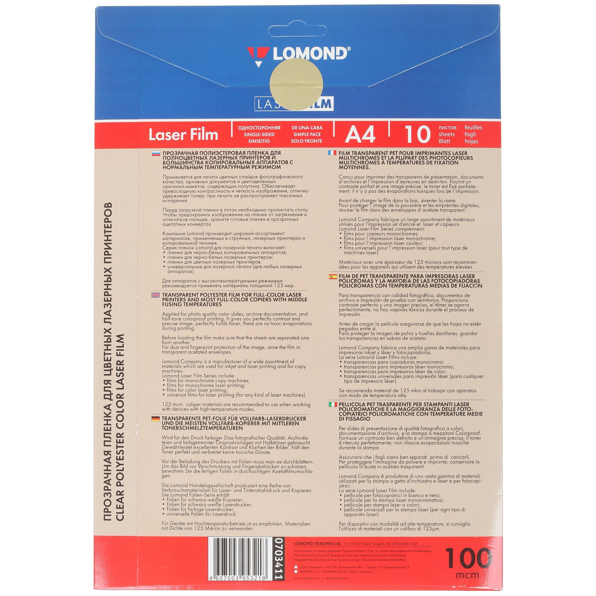 Пленка прозрачная Lomond 0703411 изготовлена из полиэстера. Она обладает толщиной 100 мкм, а формат листов – А4. Используется такая пленка для создания оригинал-макетов и слайдов. Она хорошо удерживает тонер, изображение не смазывается с поверхности материала. Также производитель гарантирует превосходное качество его нанесения.
