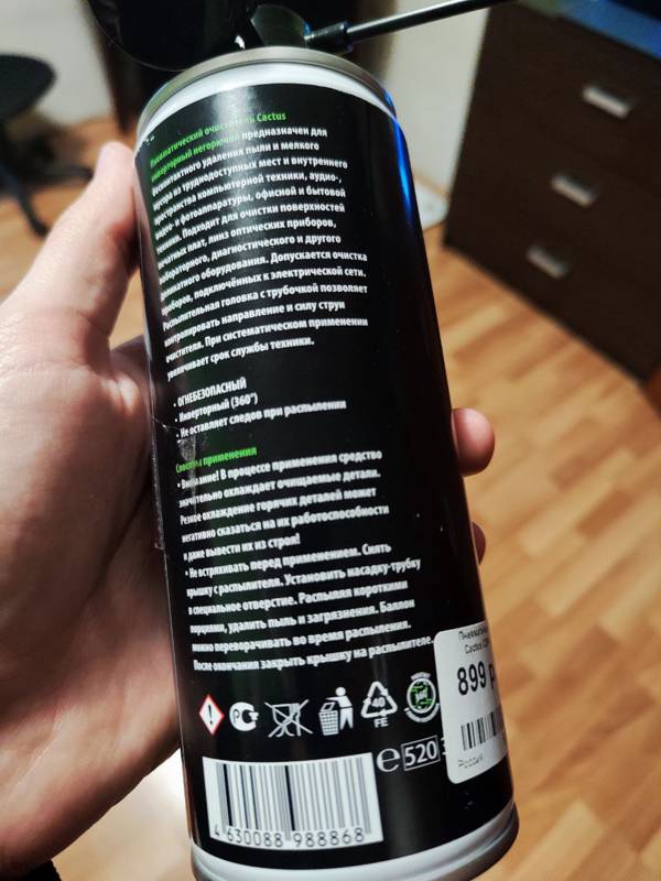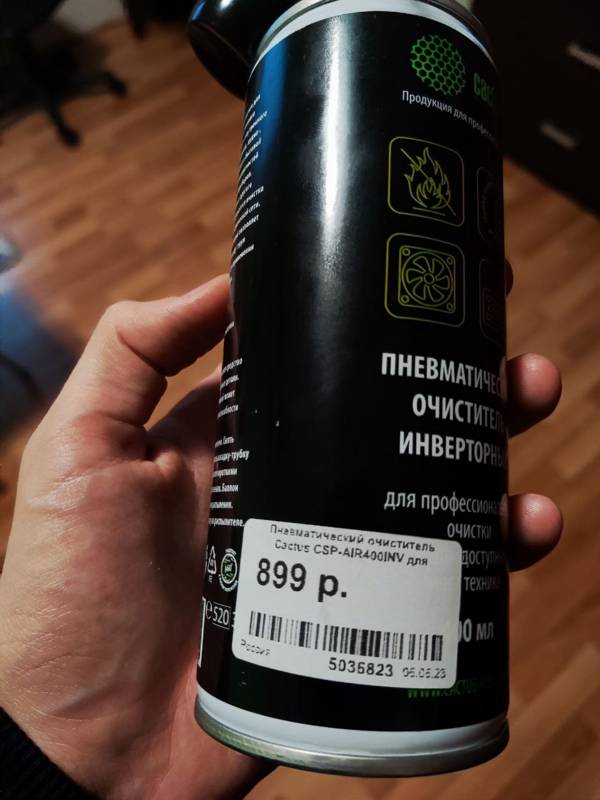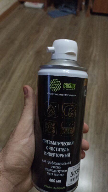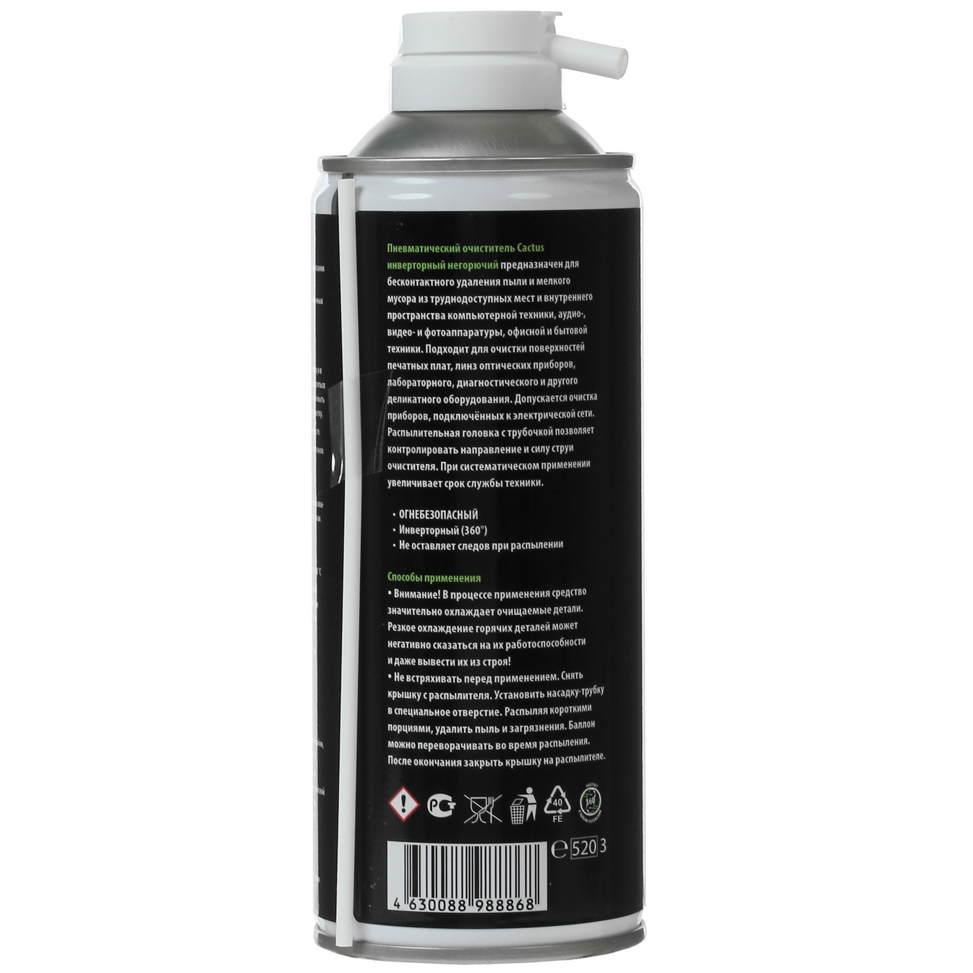 Пневматический очиститель Cactus CSP-AIR400INV поставляется в металлическом баллоне объемом 400 мл, чего достаточно на несколько месяцев использования. Спрей инверторного типа содержит сжатый воздух, который под давлением удаляет остатки загрязнений из труднодоступных мест.