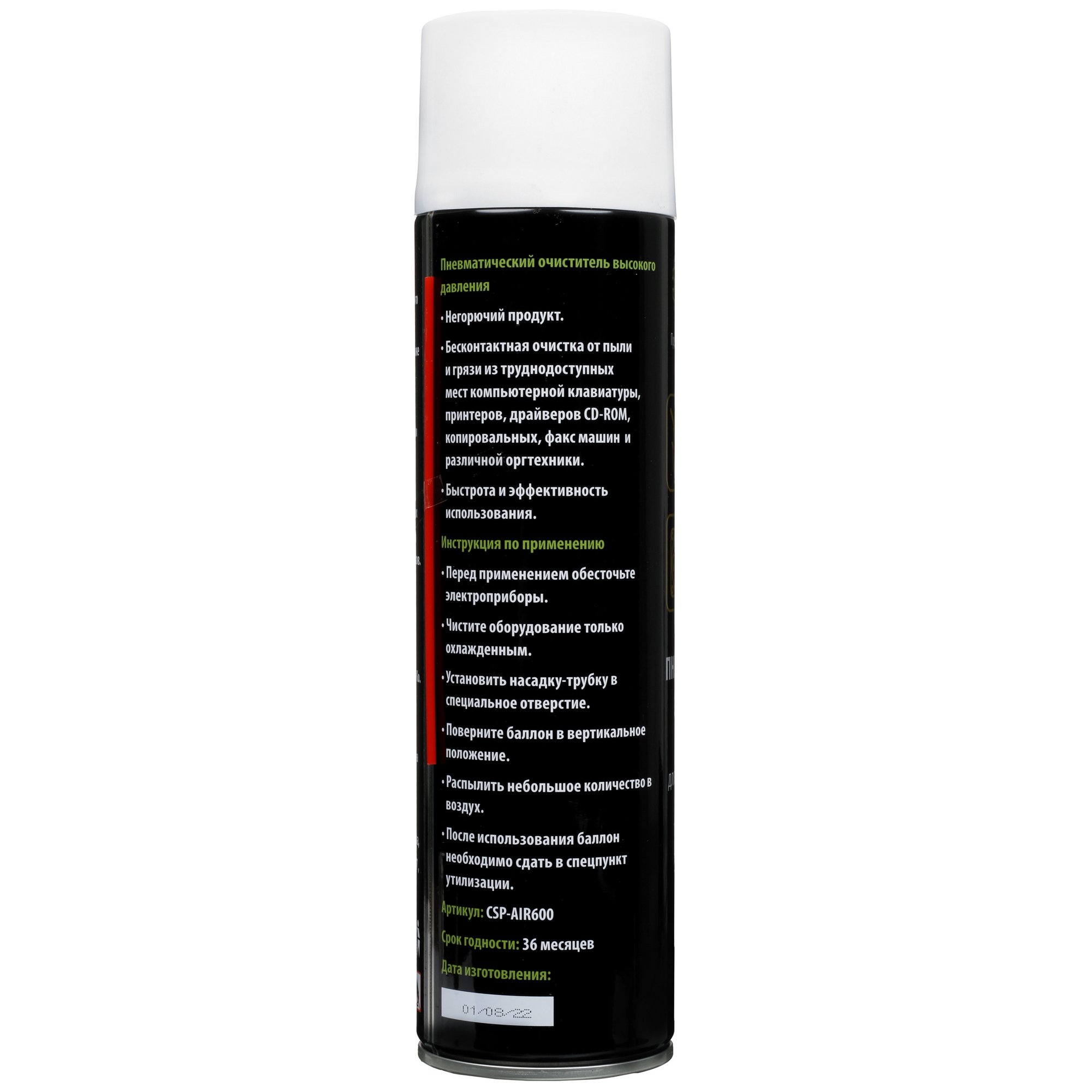 Негорючий воздух в баллоне Cactus CSP-AIR600 подается под мощным напором, быстро и эффективно удаляя загрязнения. Перед очисткой обязательно следует обесточить и охладить технику. Насадка-трубка вставляется в специальное отверстие, а баллон поворачивается вертикально. После этого небольшое количество очистителя распыляется в нужном направлении, бесконтактно удаляя пыль.
