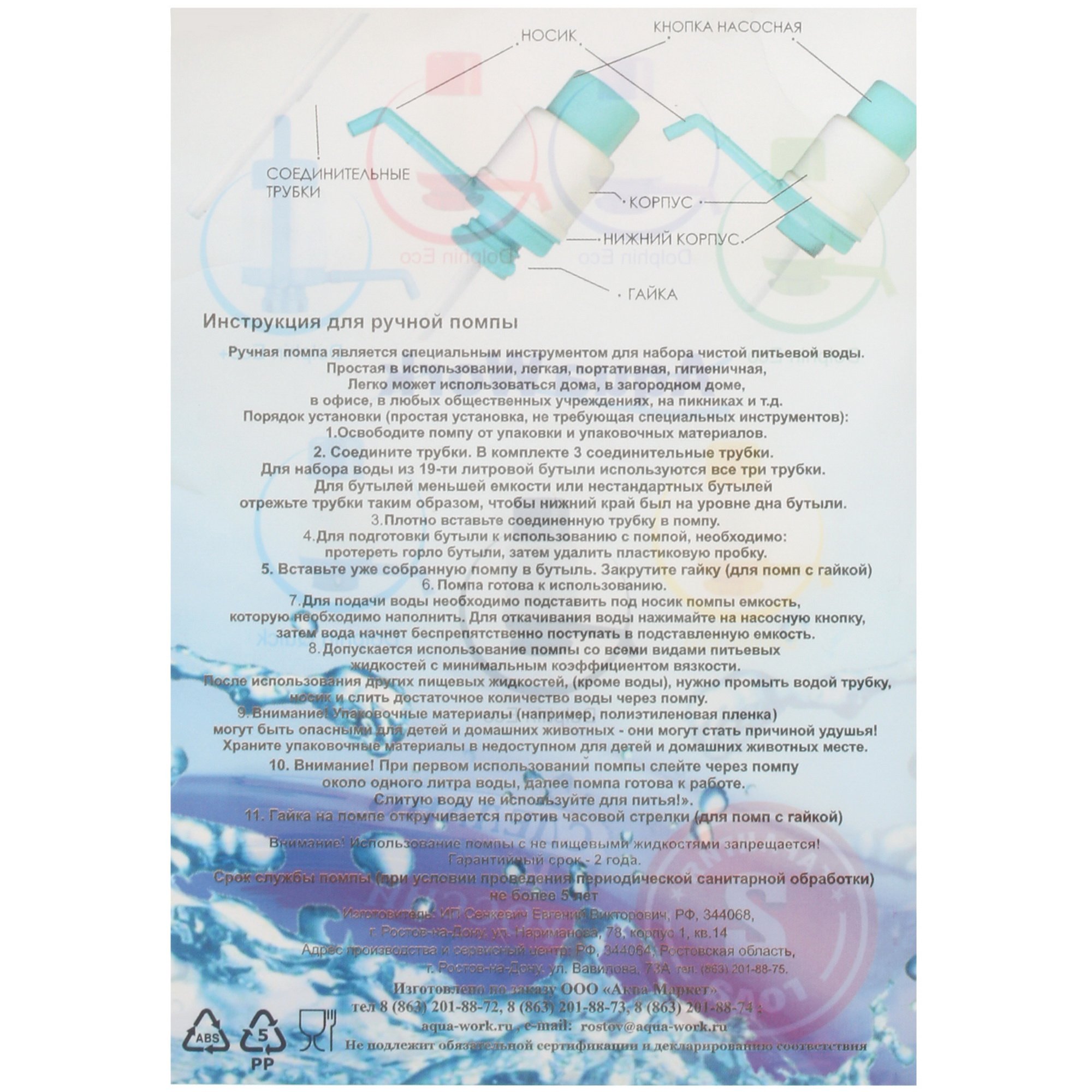Помпа для воды Дельфин ЭКО обладает простой и надежной конструкцией с механическим насосом. Эргономичная нажимная кнопка, которая не шатается и отличается низким уровнем шума, обеспечивает удобство в эксплуатации устройства. Помпа для воды Дельфин ЭКО подходит для установки на бутыли объемом 12 л и 19 л. Фиксация на горлышке бутыли осуществляется при помощи надежного цангового зажима. В комплекте поставляются съемный носик и 3 соединительные трубки. Изделие выполнено из прочного и безопасного пищевого пластика в красочной расцветке.