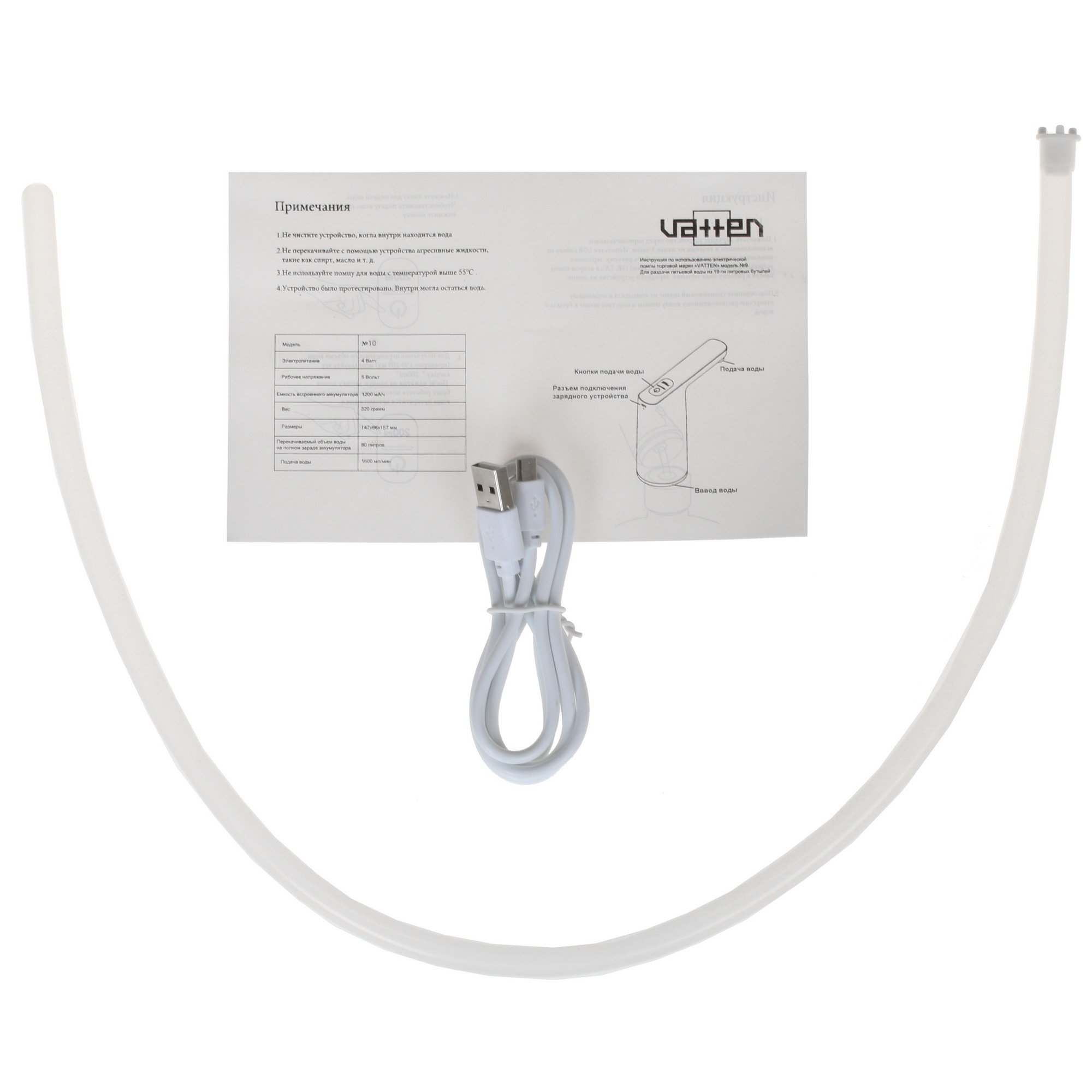 Помпа для воды Vatten №10 обеспечивает быструю подачу воды за счет использования погружного насоса, поэтому набор воды в емкость занимает минимум усилий. Данная модель помпы предназначена для совместного использования с бутылью объемом не более 19 л. Включение помпы осуществляется нажатием кнопки. Она легко надевается и надежно фиксируется с помощью зажимного гаечного механизма. Помпа Vatten №10 предусматривает получение питания от порта USB. В комплекте с помпой поставляются кабель USB и гибкий шланг.
