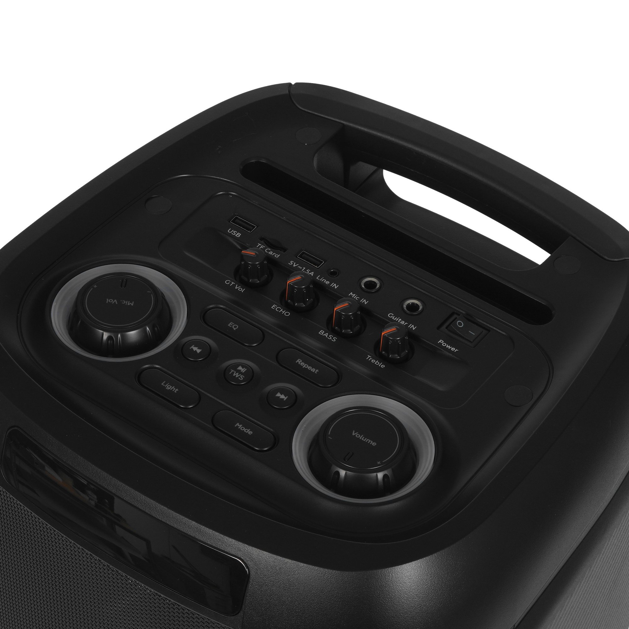 Портативная аудиосистема BQ PBS3007 в черном цвете корпуса имеет экран для управления громкостью и настройки басов и высоких частот. Подключиться к колонке можно по Bluetooth, а еще у нее есть разъемы для других устройств. Отдельно предусмотрены входы для гитары и двух микрофонов, с помощью которых можно петь караоке и настраивать на нем эффект «эхо». Если у вас есть карточка microSD, microSDHC или microSDXC с музыкой в формате Mp3 максимальным объемом 128 Гб, ее тоже можно вставить.