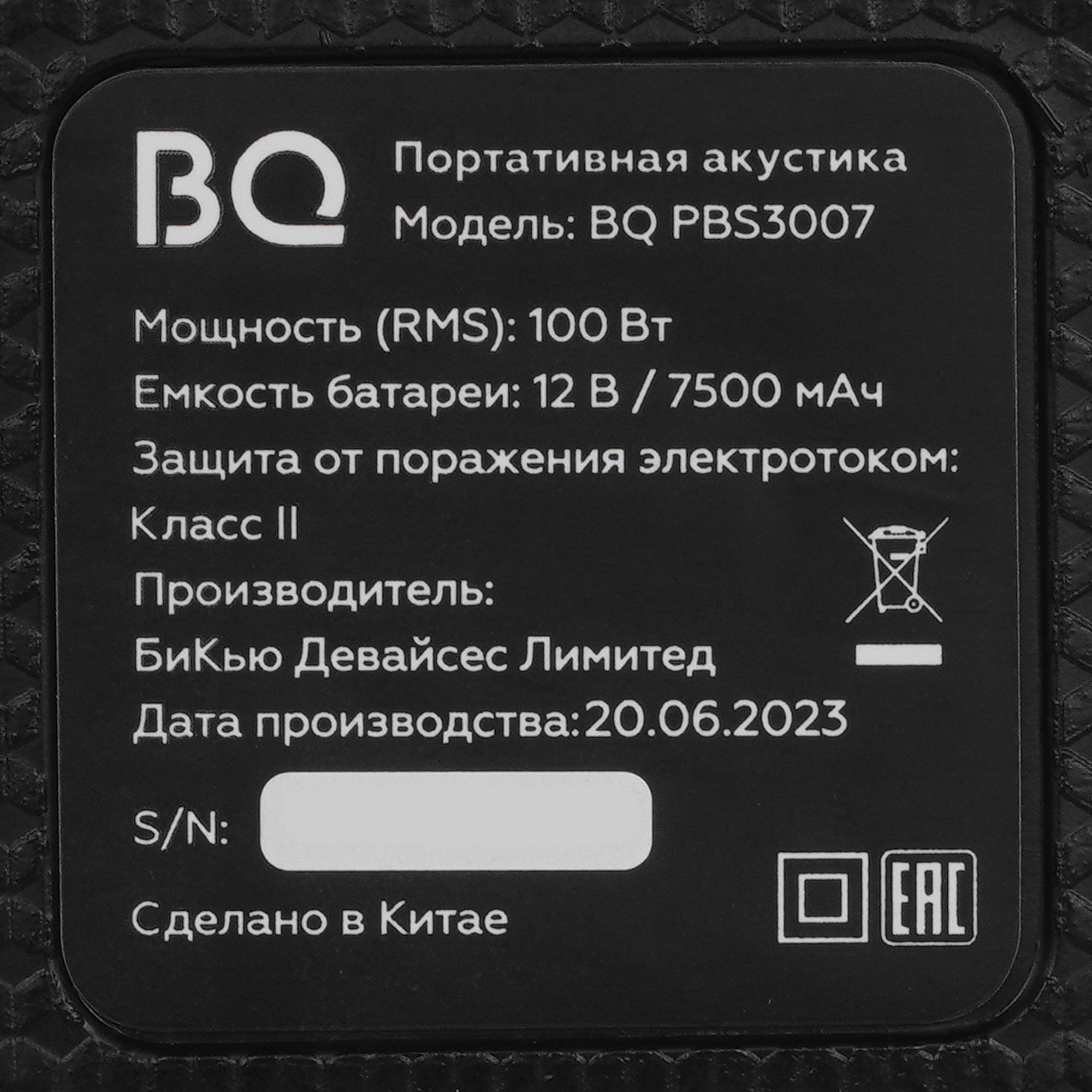 В портативной аудиосистеме BQ PBS3007 есть эквалайзер, который нужен для регулирования уровня различных частот в аудиосигнале. Стереосистема создает ощущение объема. Колонка работает от аккумулятора емкостью 7500 мА*ч, и его заряда хватит ориентировочно на 6 ч. Полностью восстановить заряд от сети можно за 8 ч.