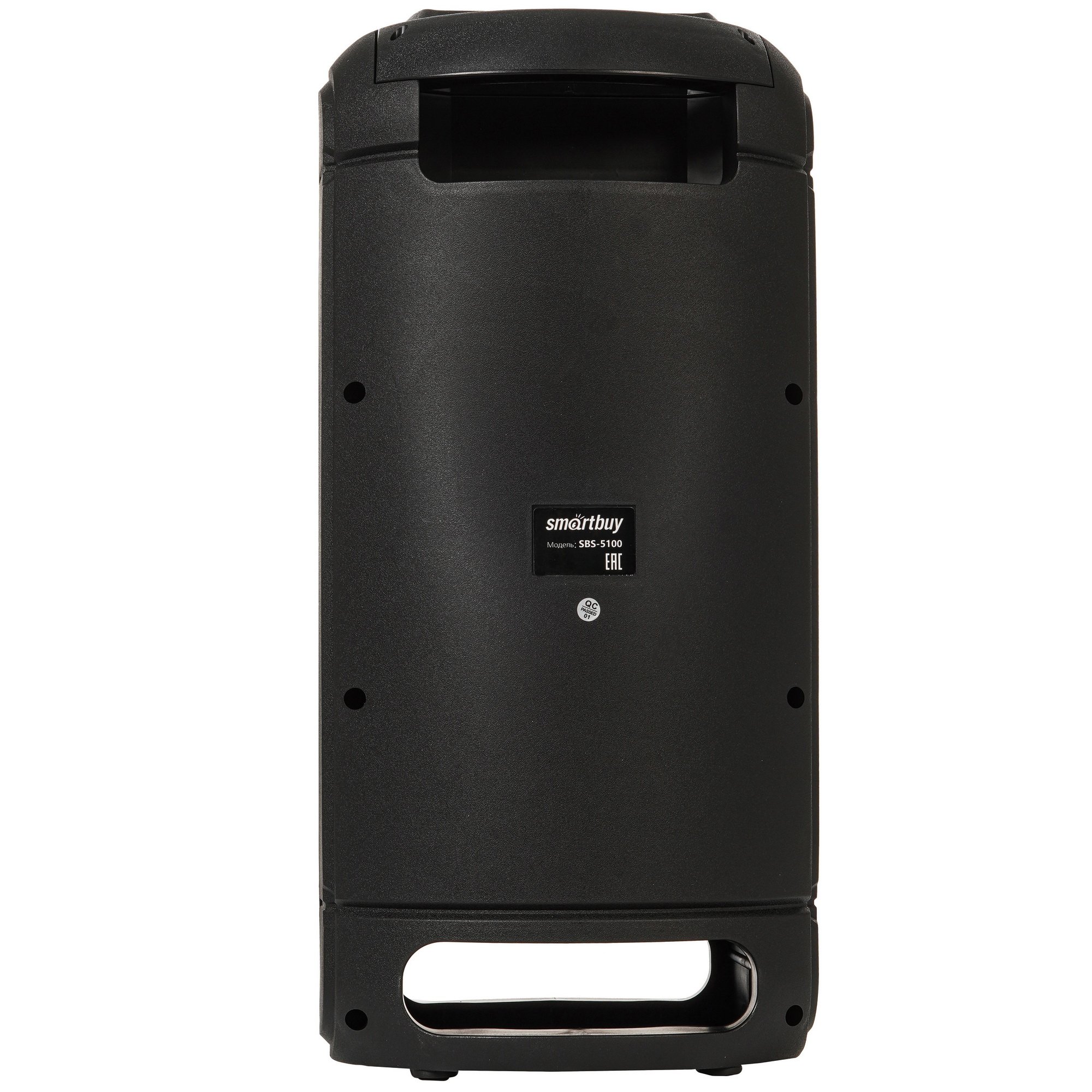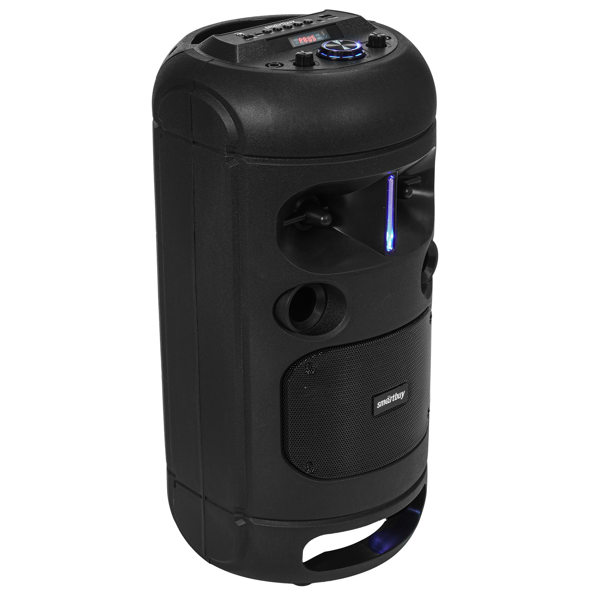 Smartbuy ROCKET оснащена дисплеем, подсветкой и регулятором на верхней панели. В корпусе есть разъем для подключения микрофона, линейный вход AUX, слот для карт памяти MicroSD и TF, USB-порт. Вы можете слушать музыку с накопителей, транслировать треки по Bluetooth со смартфона и других устройств. Модель дополнена эквалайзером, радио и караоке.