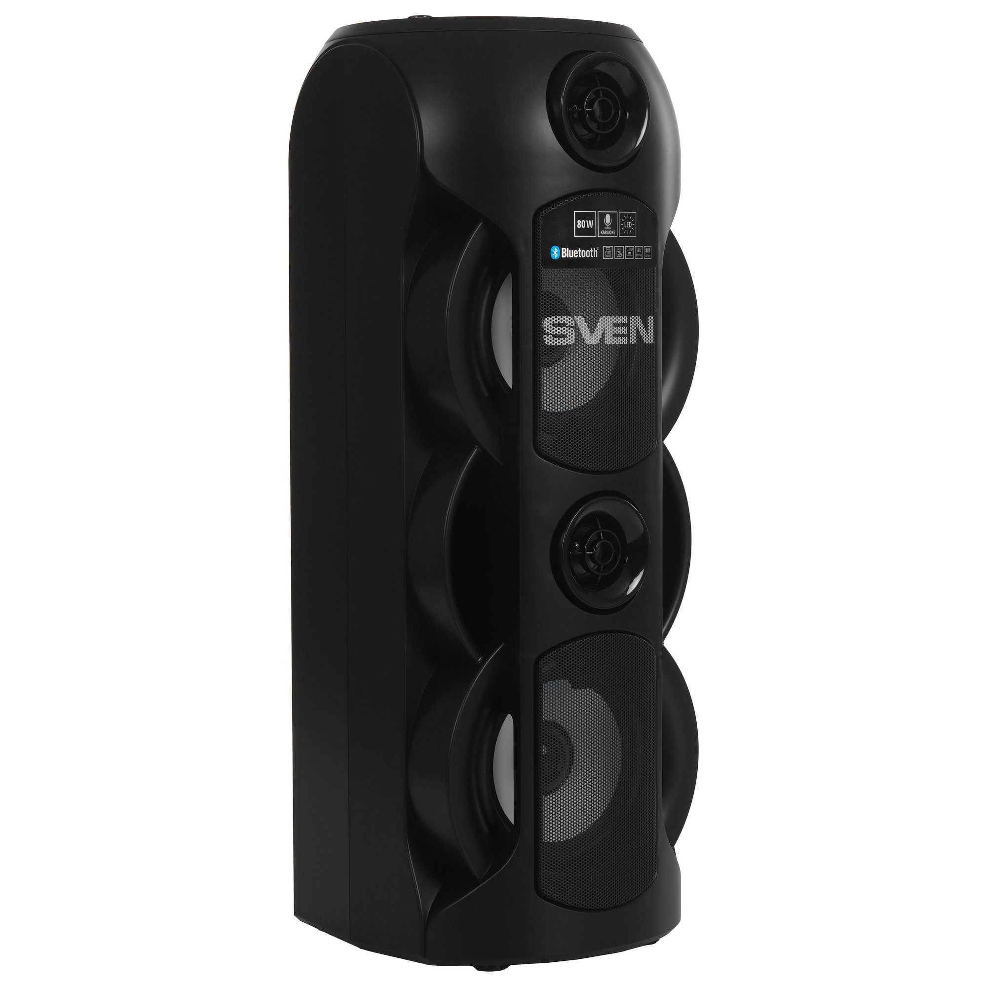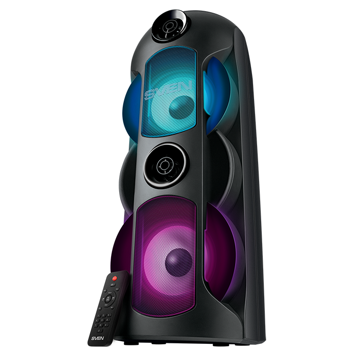 Портативная аудиосистема SVEN PS-720 с 4 динамиками общей мощностью 80 Вт оборудована разъемами для подключения двух микрофонов и функцией «Караоке» для исполнения различных композиций. Регулировать уровень частот можно с помощью эквалайзера. Подключение к ПК, телевизору, ноутбуку, смартфону осуществляется через интерфейс Bluetooth и AUX-вход.