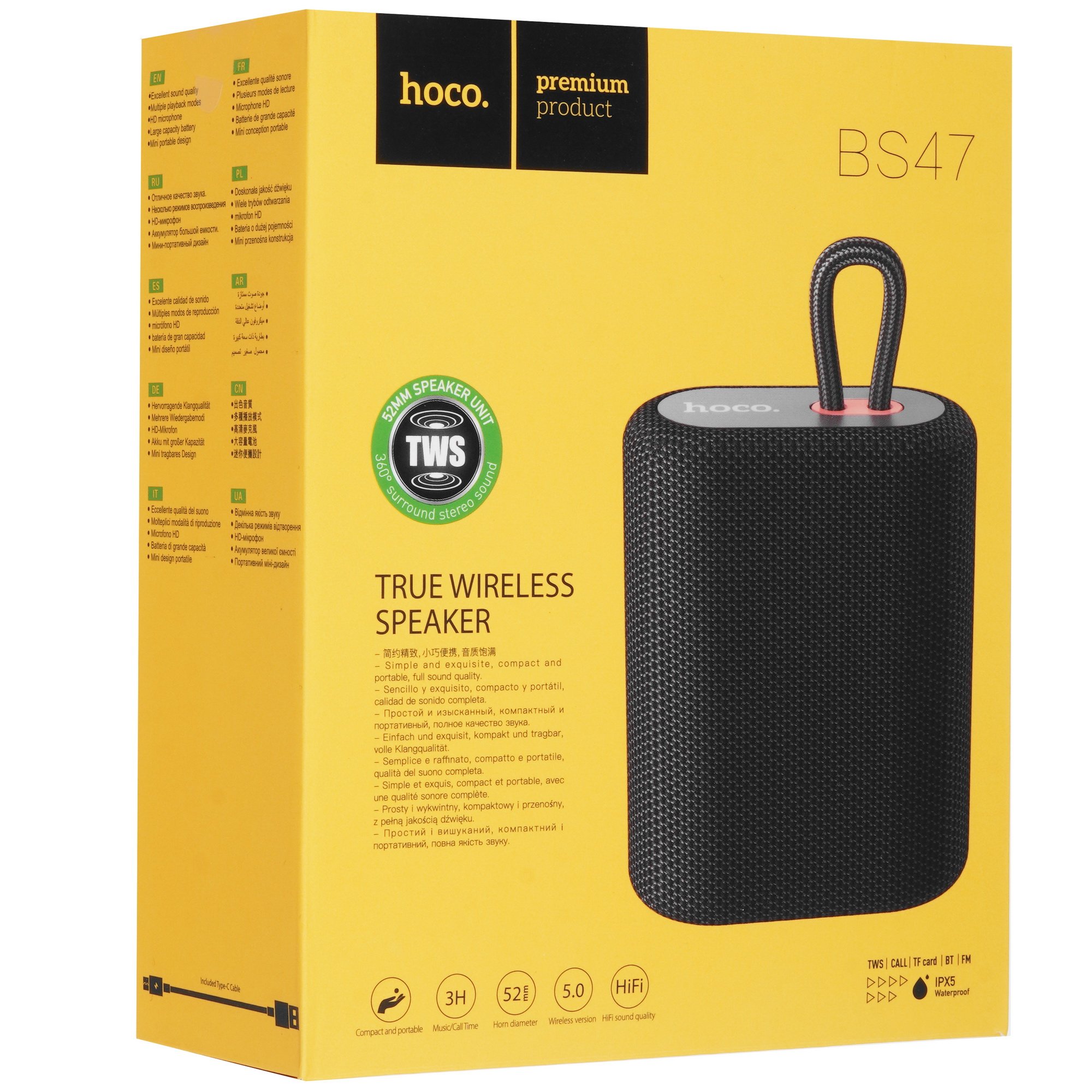 Портативная колонка HOCO BS47 черного цвета – компактная модель с размерами корпуса 93x51x114 мм, которая предусматривает шнурок для фиксации на рюкзаке. Устройство поддерживает объединение с такой же акустикой в стереопару для возможности прослушивания музыки в стереоформате. Автономную работу портативной колонки HOCO BS47 обеспечивает аккумулятор емкостью 1200 мАч, заряда которого хватит на три часа непрерывного функционирования. В конструкции устройства присутствует динамик мощностью 5 Вт, который воспроизводит звук в частотном диапазоне 100-18000 Гц.