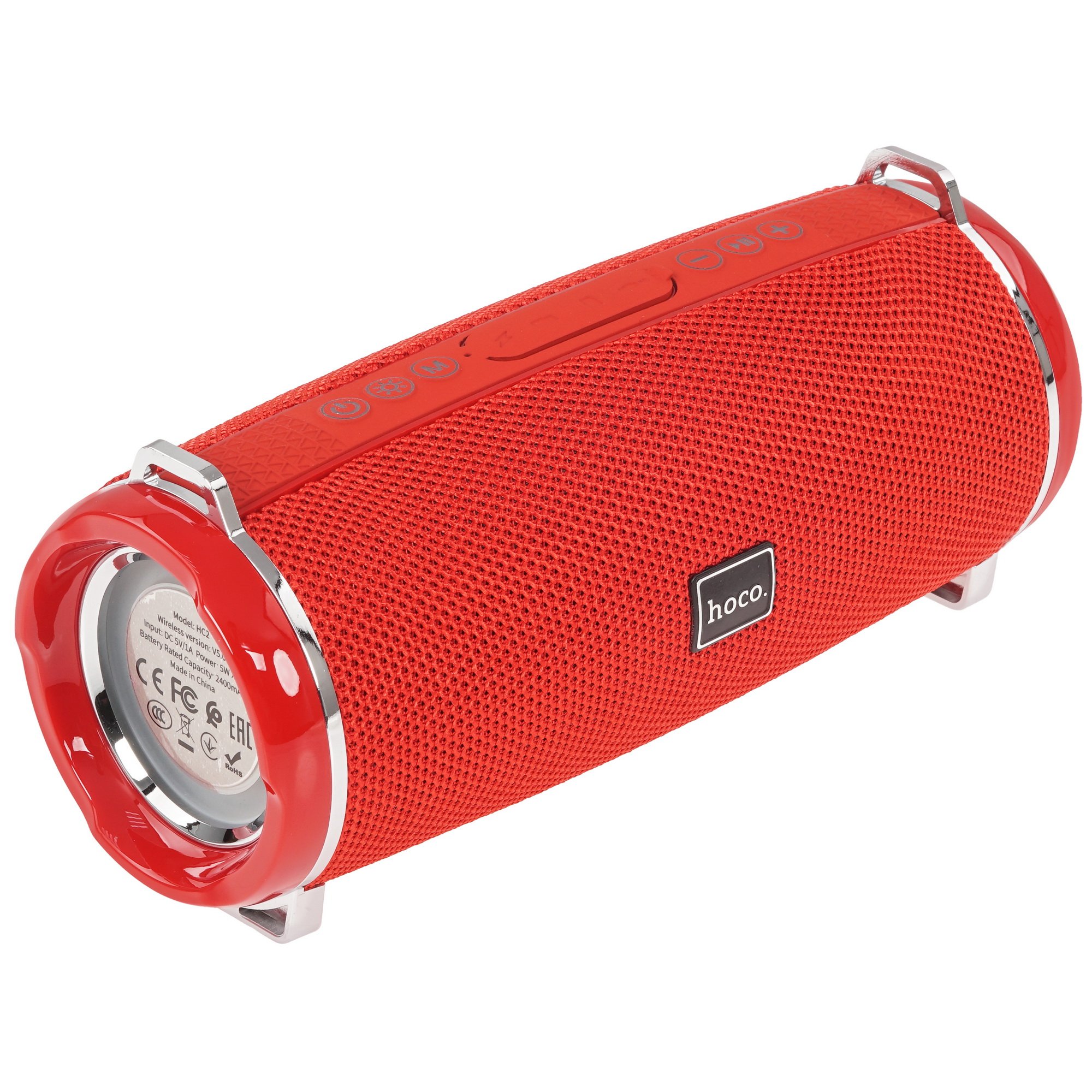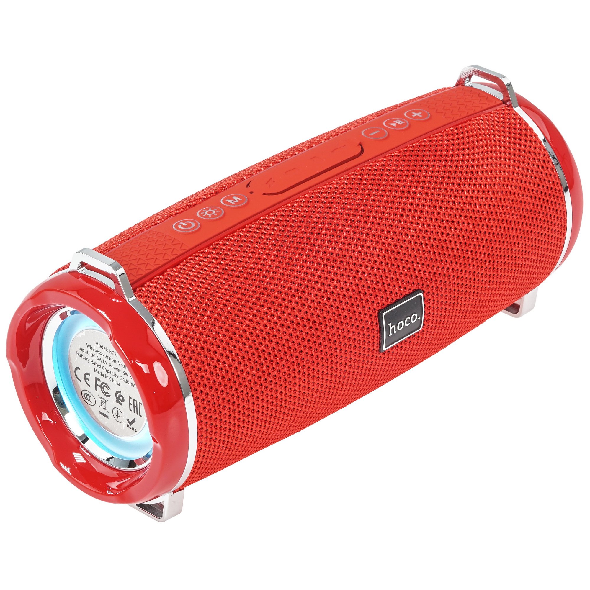 Портативная колонка HOCO HC2 выполнена в красном цвете и дополнена подсветкой с боковых сторон. Корпус из пластика и ткани с защитой IPX5 устойчив к воздействию воды. Для удобного ношения предусмотрен текстильный ремешок.