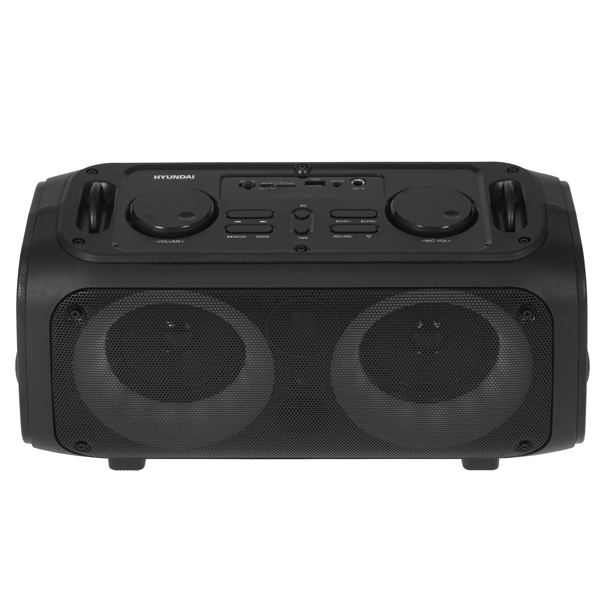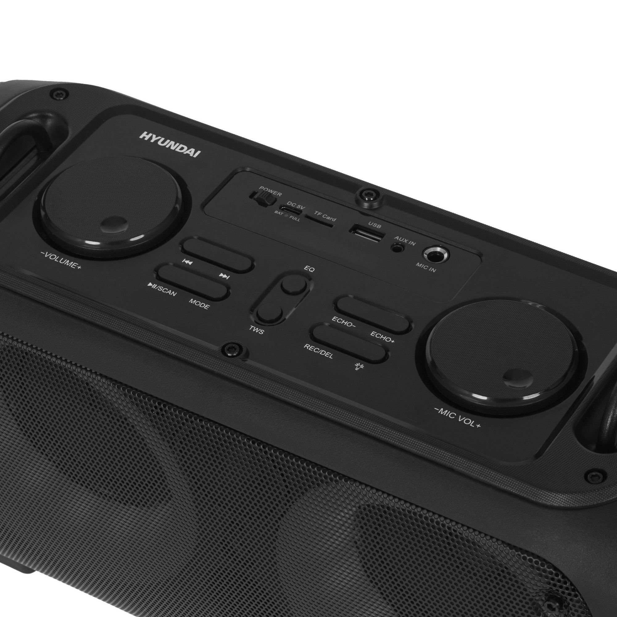 Панель на верхней части корпуса и пульт ДУ обеспечивают простое управление. Одного заряда аккумулятора емкостью 3600 мА*ч хватает для 10 часов проигрывания аудио. Ручка на боковой стороне и наплечный ремень гарантируют удобство перемещения Hyundai H-PS1030.