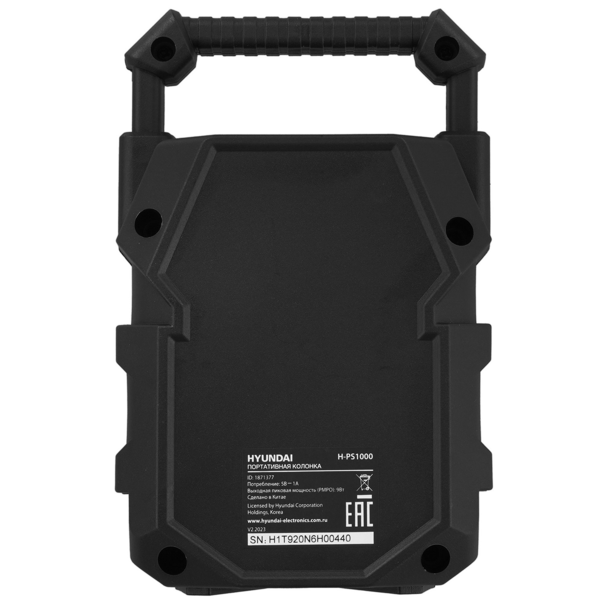 Hyundai H-PS1000 выполнена в черном корпусе с удобной ручкой для удержания и многоцветной подсветкой. Колонка работает от аккумулятора и выдерживает 5 ч работы. Это позволяет брать устройство с собой на длительную прогулку или пикник. При недостатке громкости можно объединять колонки в стереопару по технологии TWS.