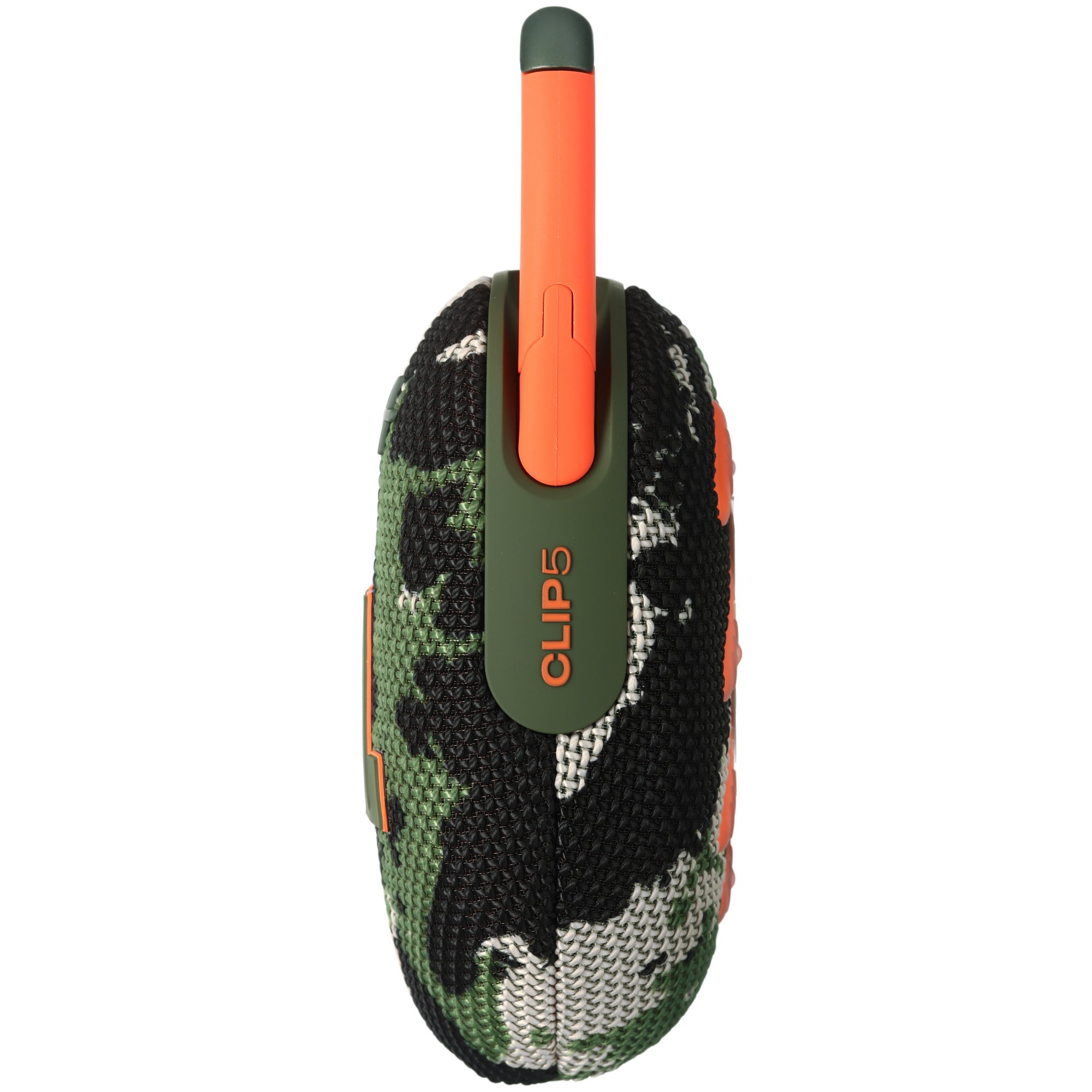 Портативная колонка JBL CLIP 5 выполнена в корпусе зеленого цвета с тканевой отделкой «хаки». Металлический карабин обеспечивает прочную и удобную фиксацию на ремне, сумке, рюкзаке. Благодаря защищенной конструкции по стандарту IPX7 колонка устойчива к воздействию влаги, брызг воды, атмосферных осадков, пыли.