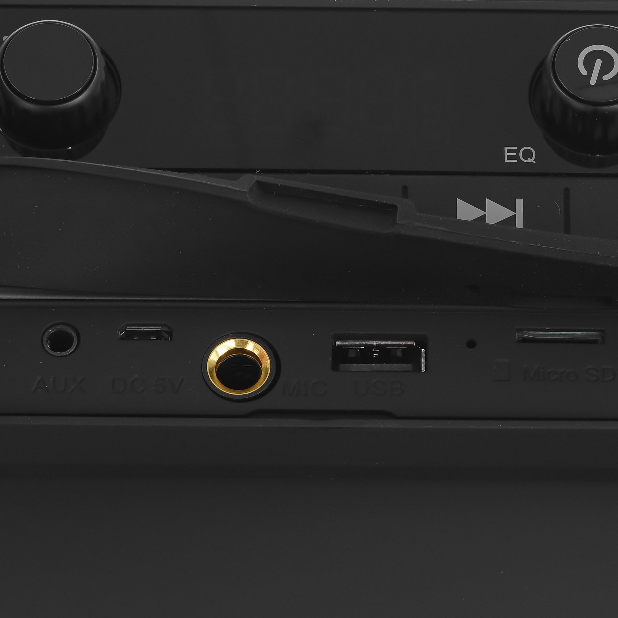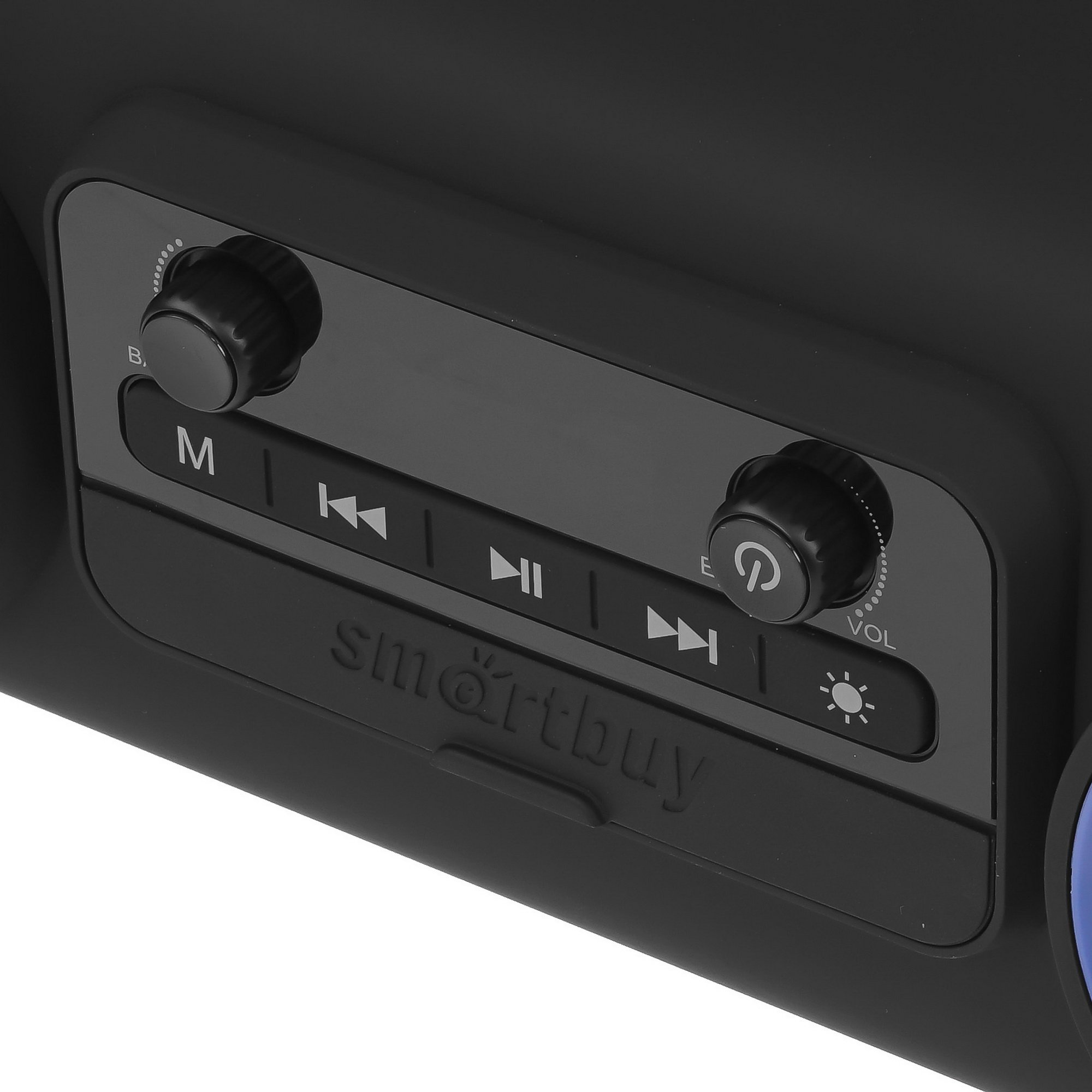 На корпусе Smartbuy VALKYR есть AUX-разъем и вход для микрофона, microSD-слот и USB-порт для воспроизведения музыки с внешних накопителей. Вы можете подключать колонку к ноутбуку или мобильным устройствам по Bluetooth, управлять настройками со смартфона. Аккумуляторная модель выдерживает до 8 ч автономной работы.