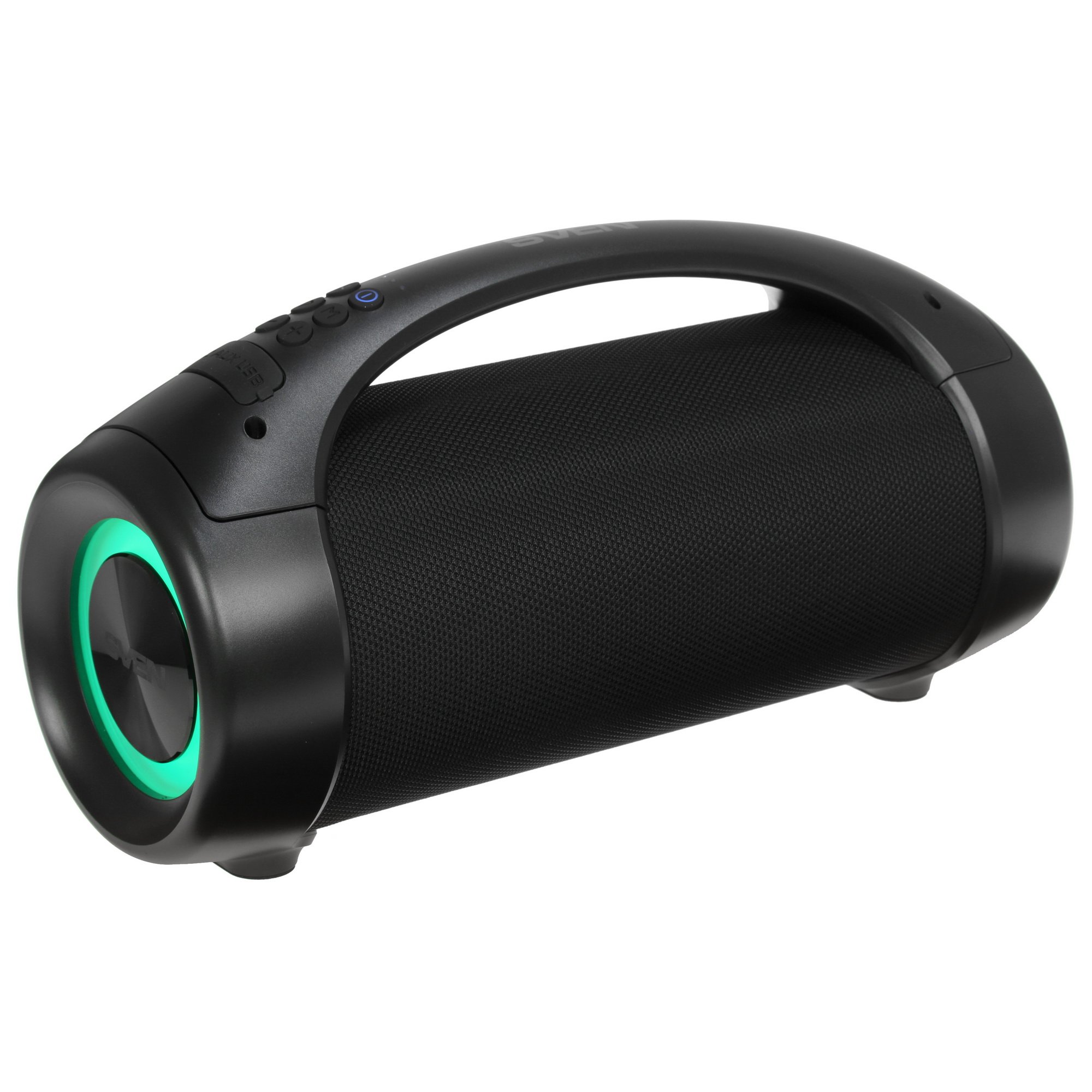 Особенность колонки Sven PS-370 в использовании для питания аккумулятора емкостью 7200 мА·ч. Он позволит акустической системе работать непрерывно до 8 ч. К смартфону подключение происходит по Bluetooth или через AUX-кабель. Беспроводная технология обеспечит мгновенное и устойчивое подключение в радиусе 10 м. Благодаря разъему USB к этой колонке можно подключать накопители с сохраненными списками воспроизведения. Панель управления с кнопками расположена на ручке колонки.